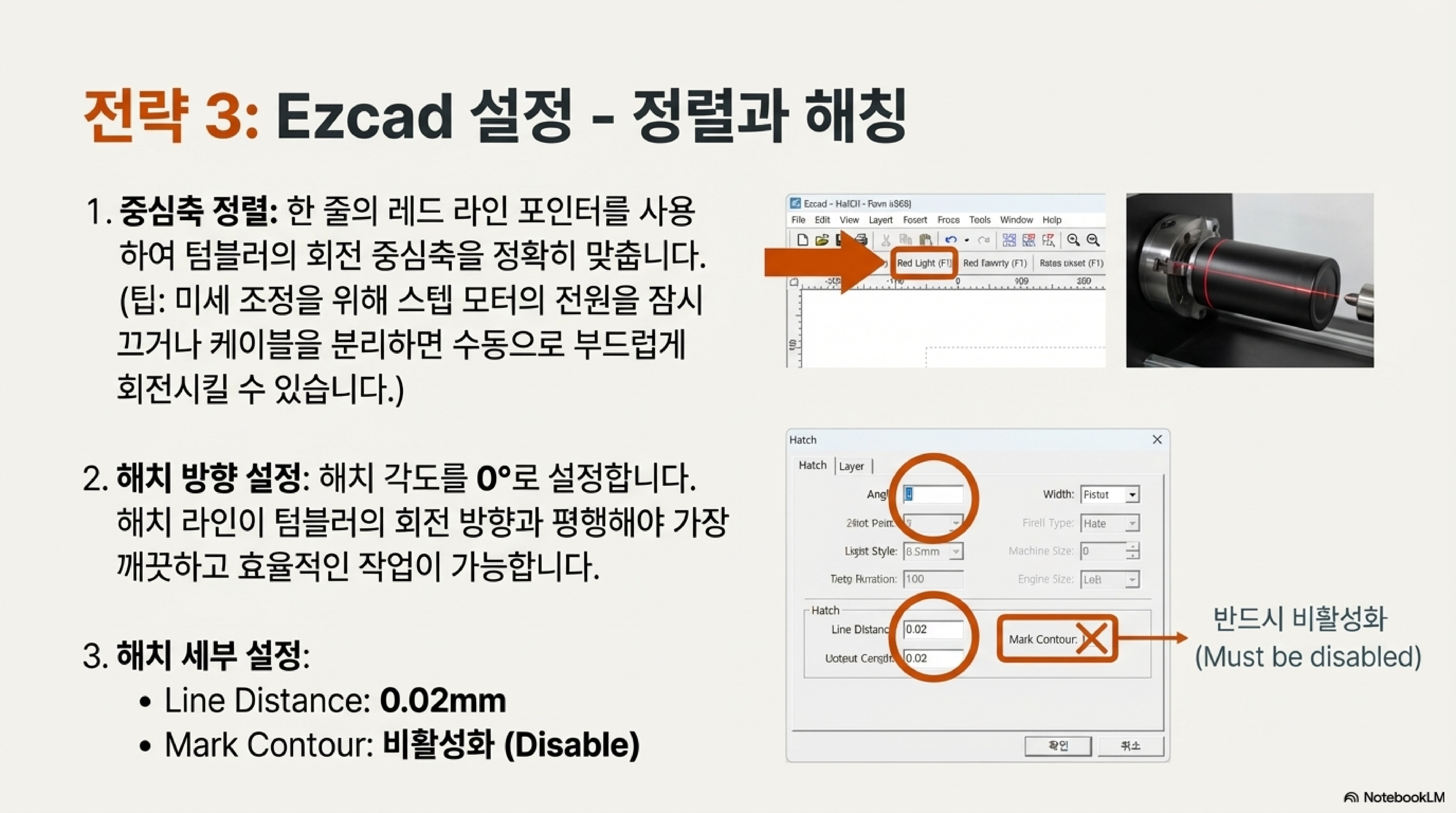 만약 해칭 방향을 잘못 설정하여(예: 좌우로 움직이는 선) 작업하면, 레이저는 텀블러 전체를 가로지르기 위해 아주 작은 점들("little blips")을 찍는 방식으로 작업하게 됩니다. 이는 작업 속도를 극도로 느리게 만들 뿐만 아니라, 연결되지 않은 점들로 인해 지저분하고 미완성된 것처럼 보이는 결과물을 낳습니다. 튜토리얼에서 사용된 최적의 해칭 설정은 선 간격(Line Distance) 0.02mm이며, 교차 해칭(cross-hatching)은 사용하지 않았습니다.
