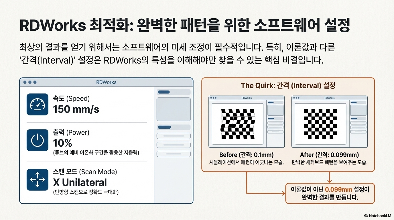 수많은 테스트 끝에, 비직관적인 해결책이 모습을 드러냈습니다. 스캔 간격을 0.1mm보다 불과 0.001mm 작은 0.099mm로 설정하자, 거짓말처럼 완벽한 체커보드 패턴이 생성된 것입니다. 이는 RDWorks 소프트웨어 내부에 존재하는 일종의 '스캔 계산 문제' 때문으로 추측됩니다. 이 사례는 때로는 설명서에 없는 문제에 직면하더라도, 끈기 있는 실험을 통해 스스로 해결책을 찾아낼 수 있다는 메이커 정신의 가치를 보여줍니다.