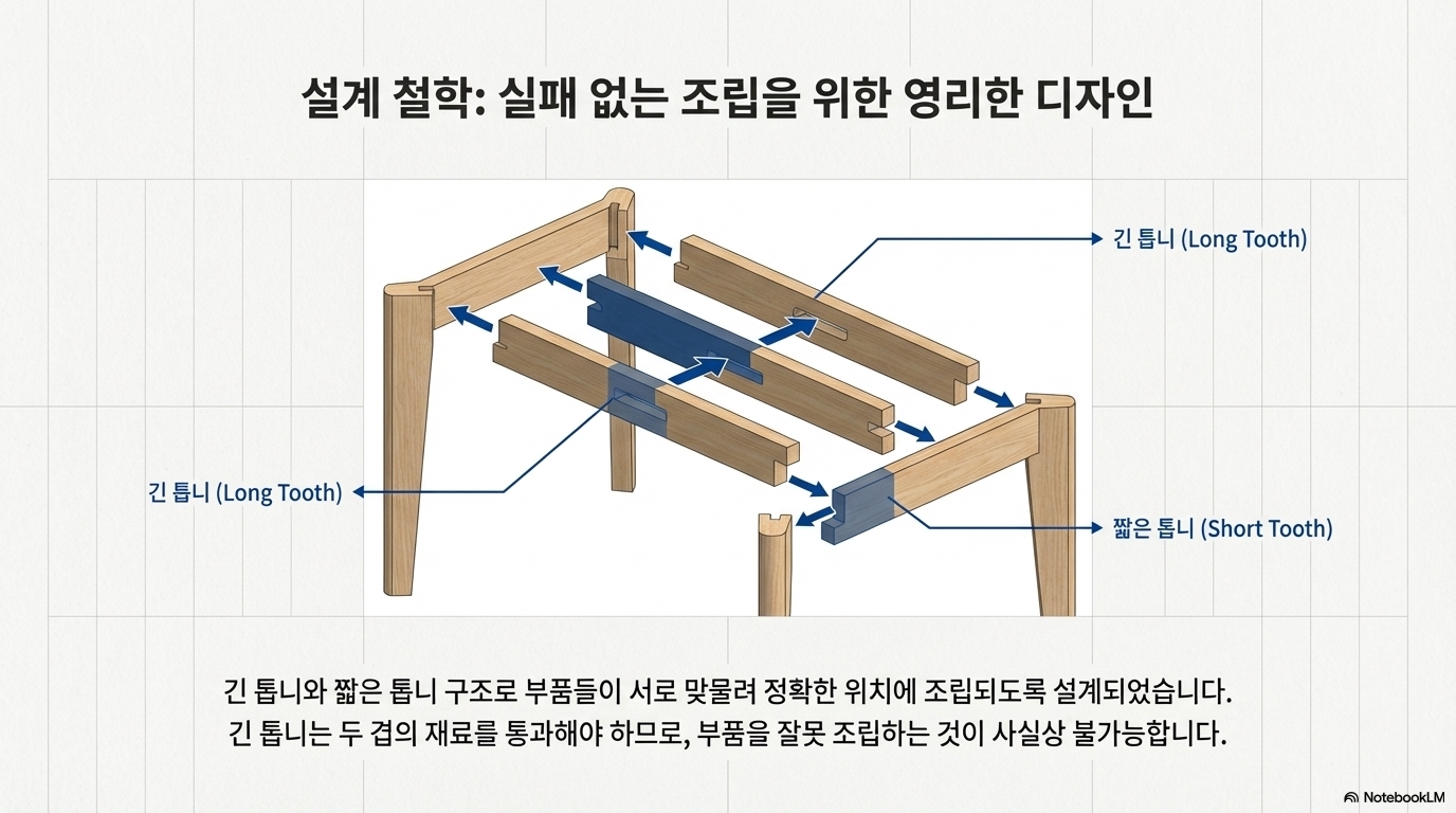이 진공 테이블의 조립 과정은 '포카요케(Poka-yoke)', 즉 실수를 미연에 방지하는 설계 철학이 무엇인지 명확하게 보여줍니다. 각 부품은 길고 짧은 톱니 모양으로 디자인되어 있어, 정해진 방향으로만 조립할 수 있습니다. 디자인은 지극히 간단하지만 영리합니다. 긴 톱니는 바닥의 재료 두 개 층을 관통해 고정되도록 설계되었고, 짧은 톱니는 한 개 층만 통과합니다. 따라서 물리적으로 부품을 잘못된 방향으로 조립하는 것이 불가능합니다. 디자인 자체가 설명서의 역할을 하는 셈입니다.