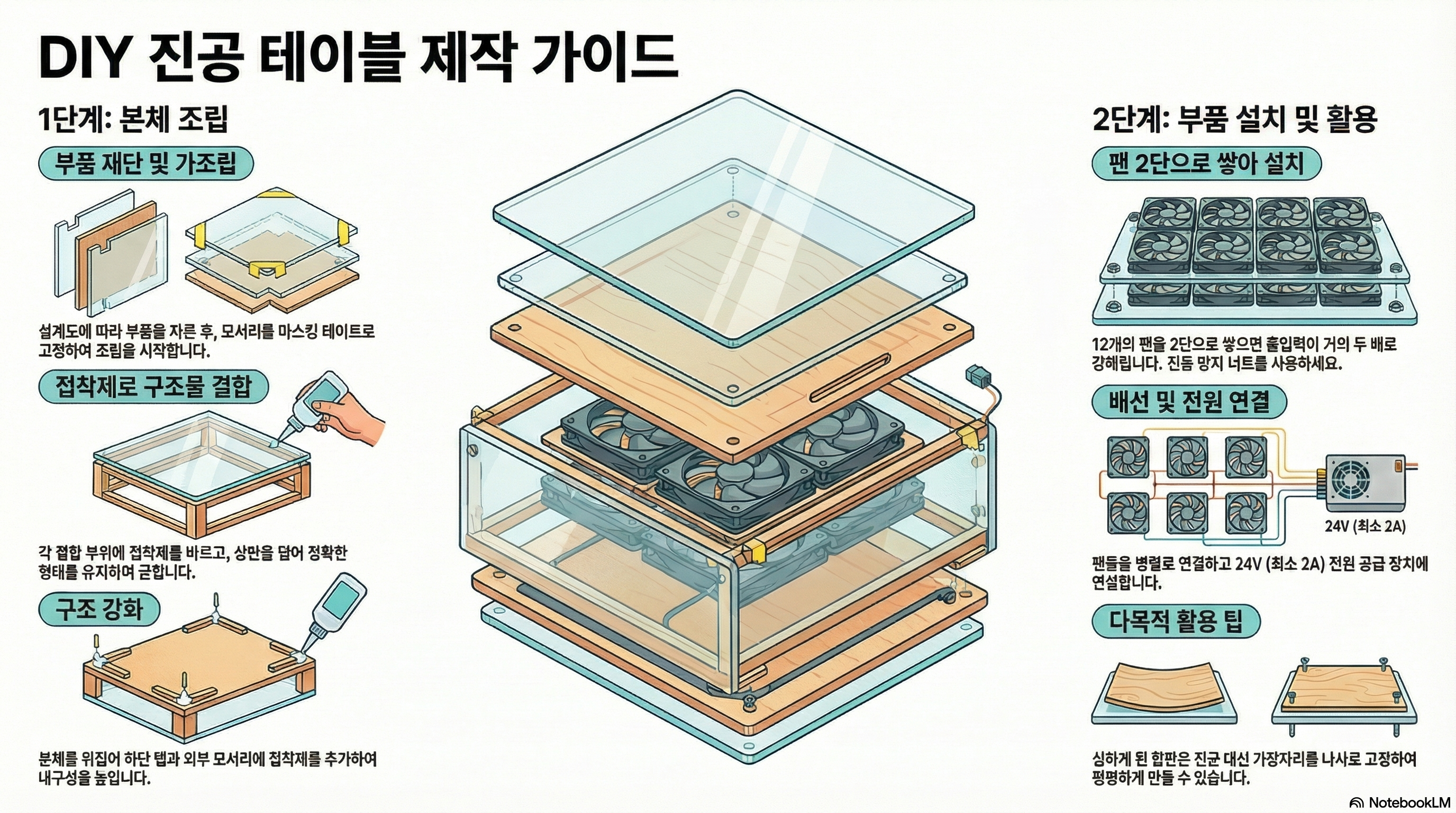 때로는 가장 효과적인 해결책이 가장 직관적이지 않은 곳에서 나옵니다. 제작자는 더 강한 흡입력을 얻기 위해 비싸고 강력한 단일 팬을 찾는 대신, 다른 사람의 제안에 따라 저렴한 팬 두 개를 직렬로 쌓는 아이디어를 채택했습니다. 놀랍게도 이 간단한 방법으로 "흡입력을 거의 두 배로" 만들 수 있다는 것을 발견하고, 이를 확장하여 총 12개의 팬을 6쌍으로 묶어 격자 형태로 배치했습니다.