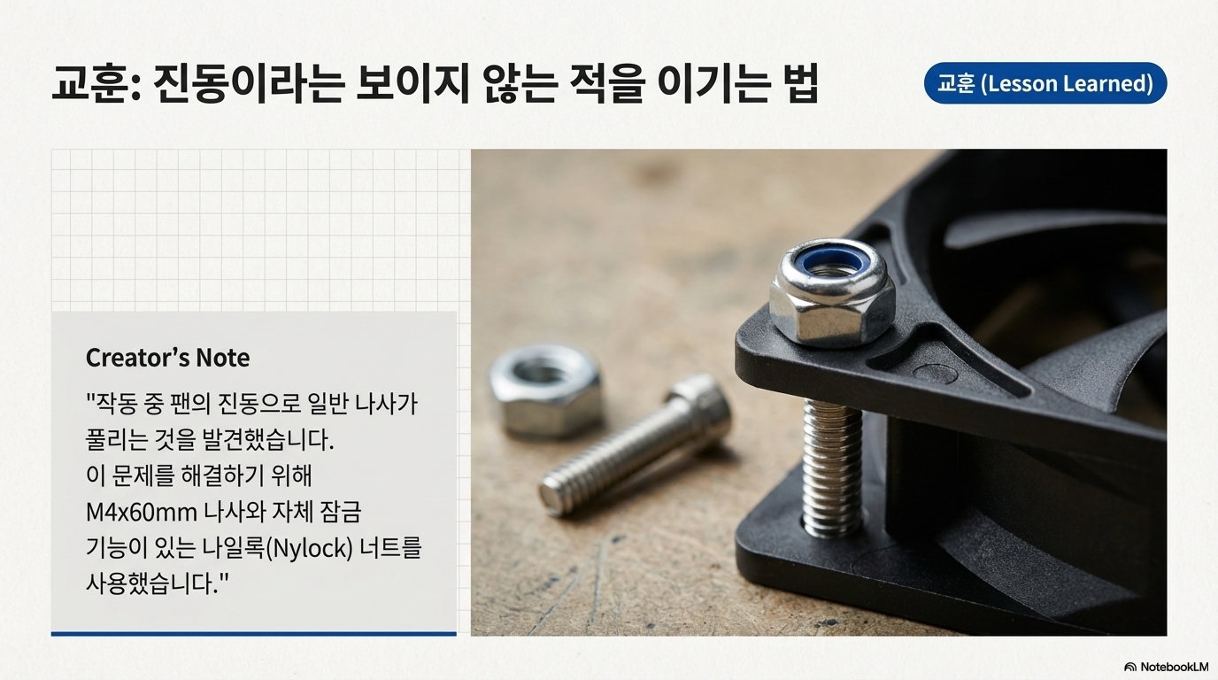 이 경험은 모터나 팬처럼 움직이는 부품이 포함된 모든 프로젝트에 적용되는 중요한 교훈을 줍니다. 눈에 보이지 않는 진동이 시간이 지나면서 어떻게 시스템의 안정성을 위협할 수 있는지, 그리고 나일록 너트 같은 작고 선제적인 선택 하나가 어떻게 미래의 고장을 막을 수 있는지를 명확히 보여줍니다.