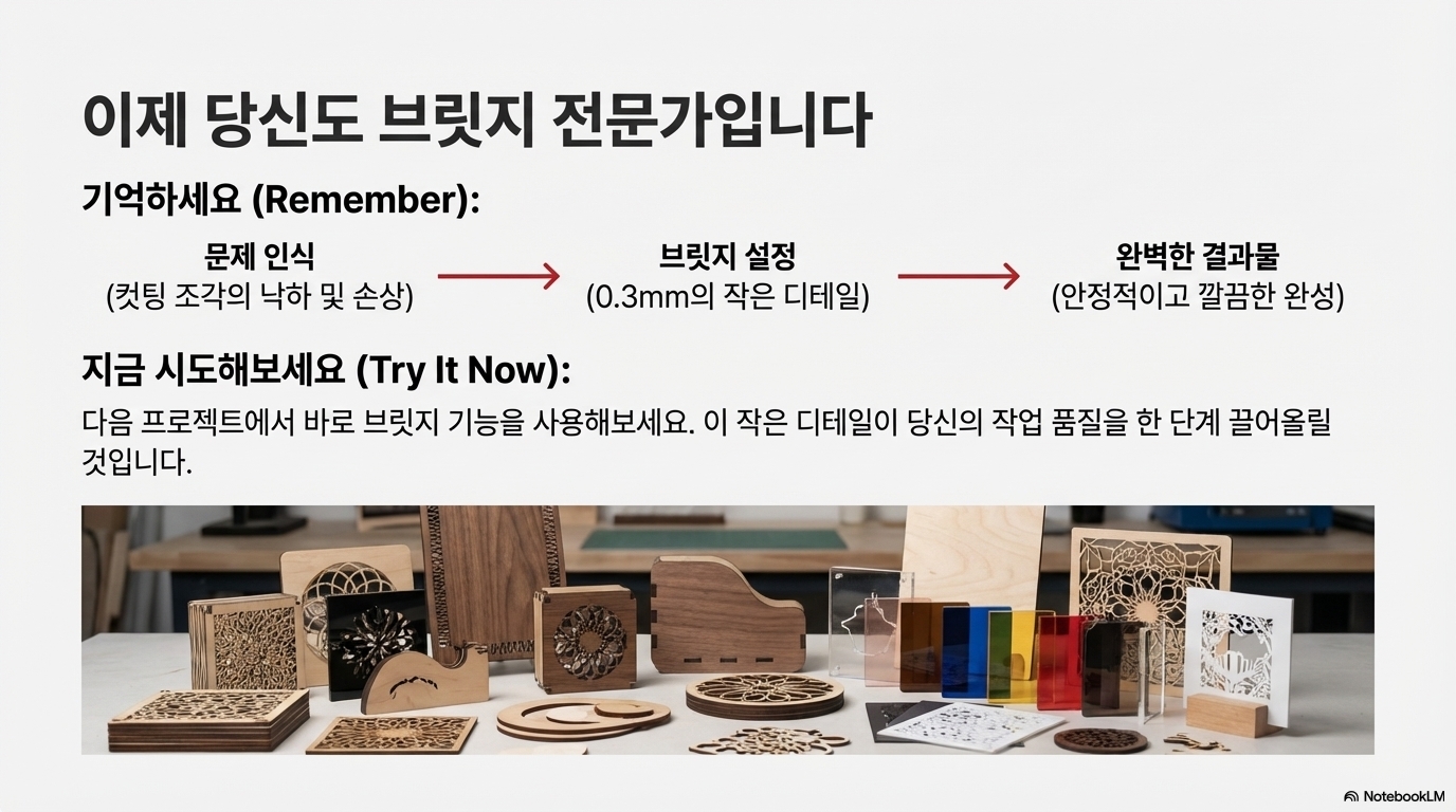 오늘 소개한 '브리지' 기술처럼, 때로는 아주 작은 디테일 하나가 작업의 성패를 가르고 결과물의 품질을 극적으로 바꾸어 놓습니다. '더 잘 자르는 법'을 고민하는 과정에서 역설적으로 '자르지 않는' 지점을 만드는 지혜가 필요한 순간이 있다는 것은 우리에게 많은 것을 시사합니다.