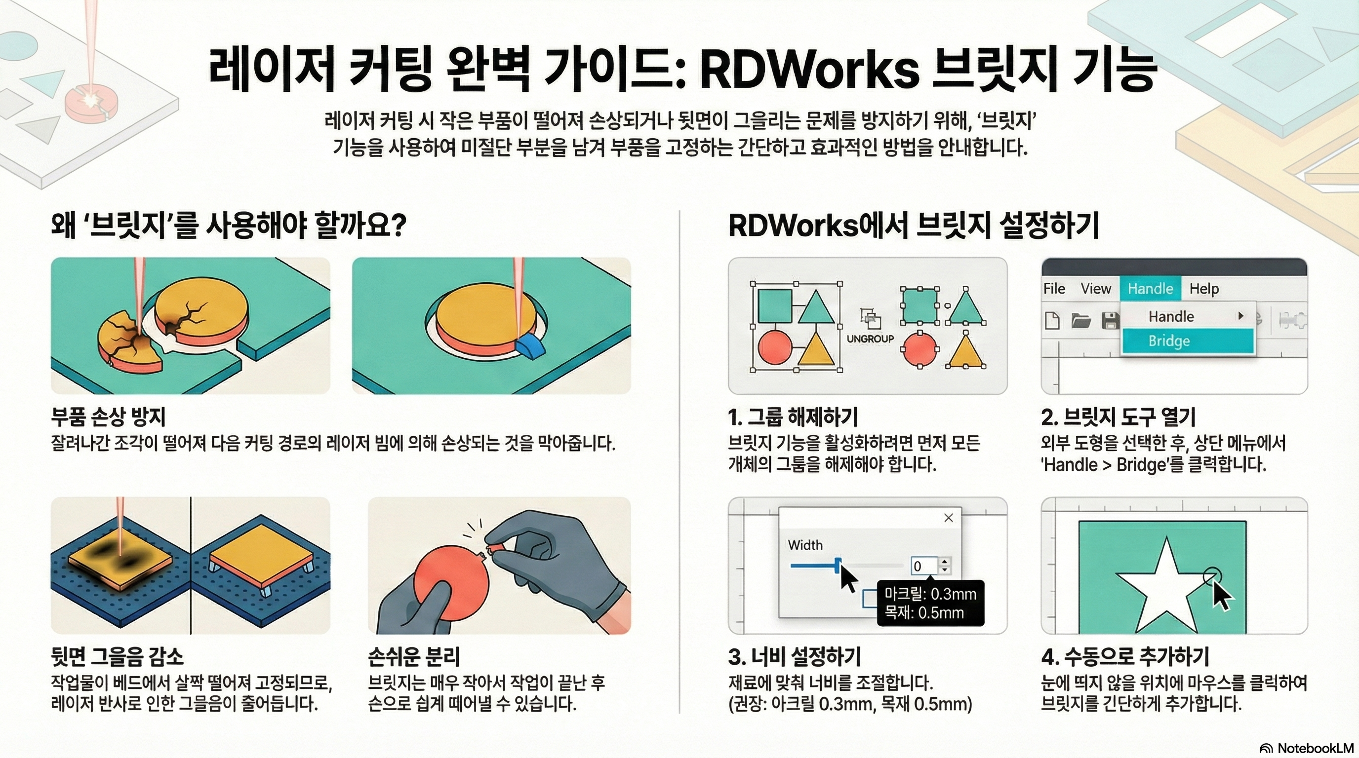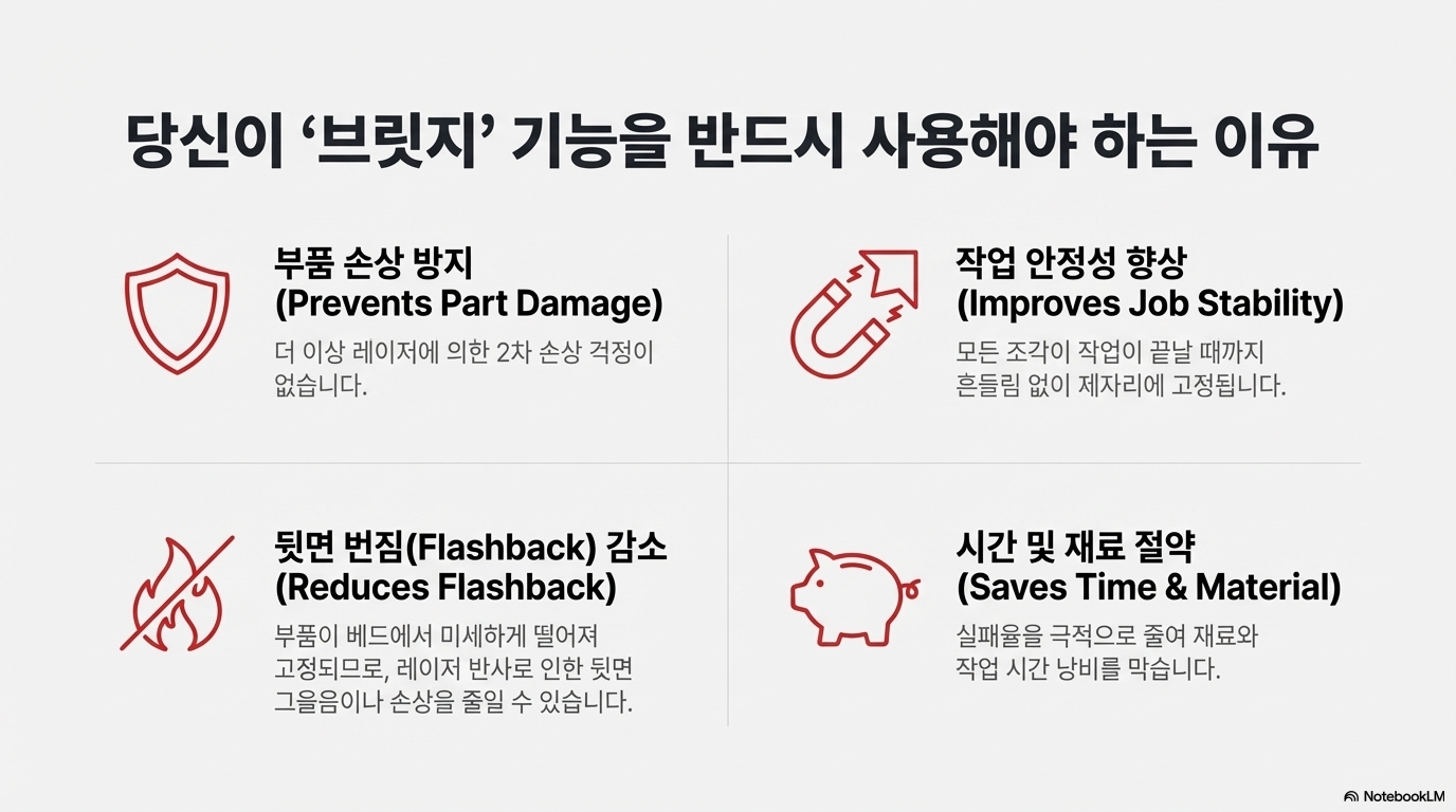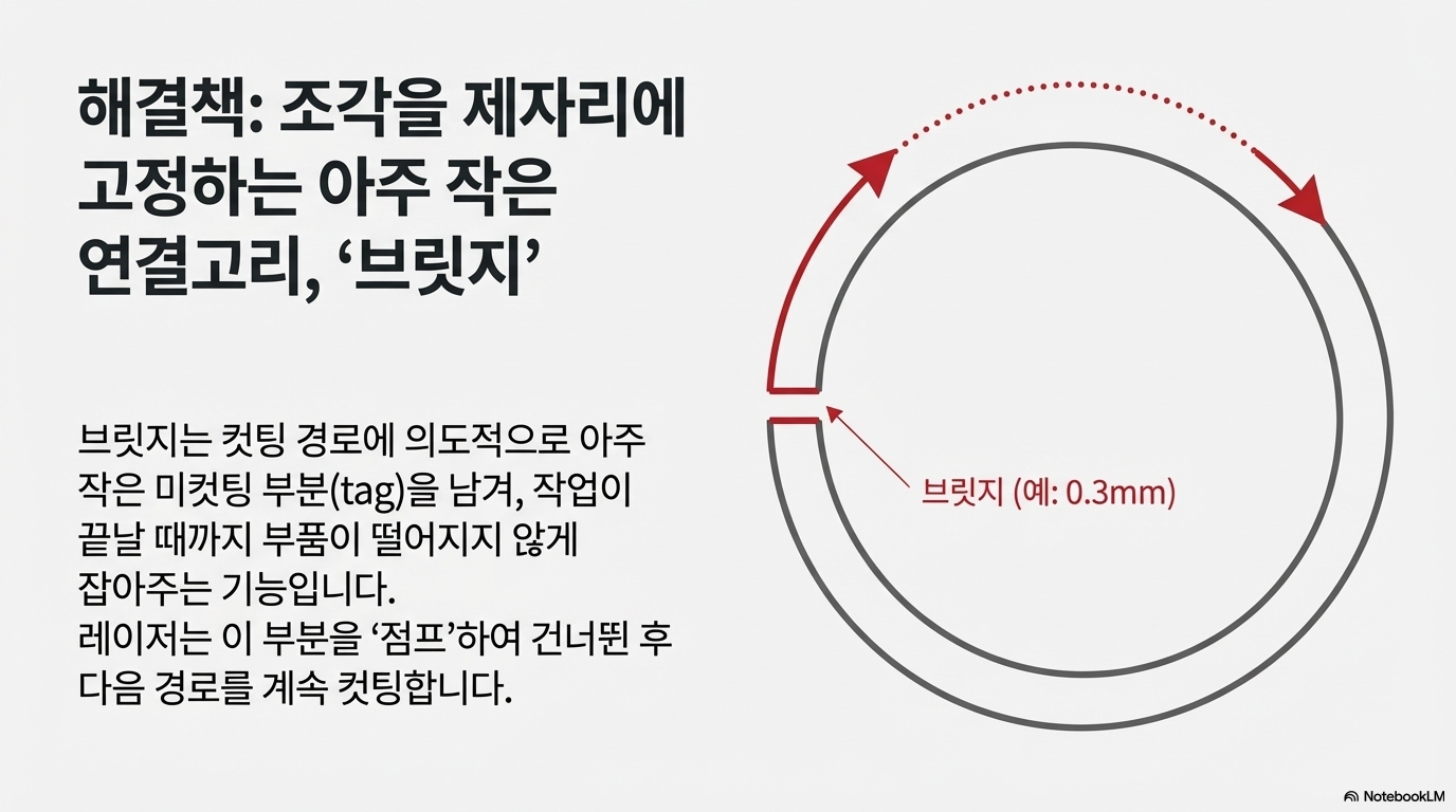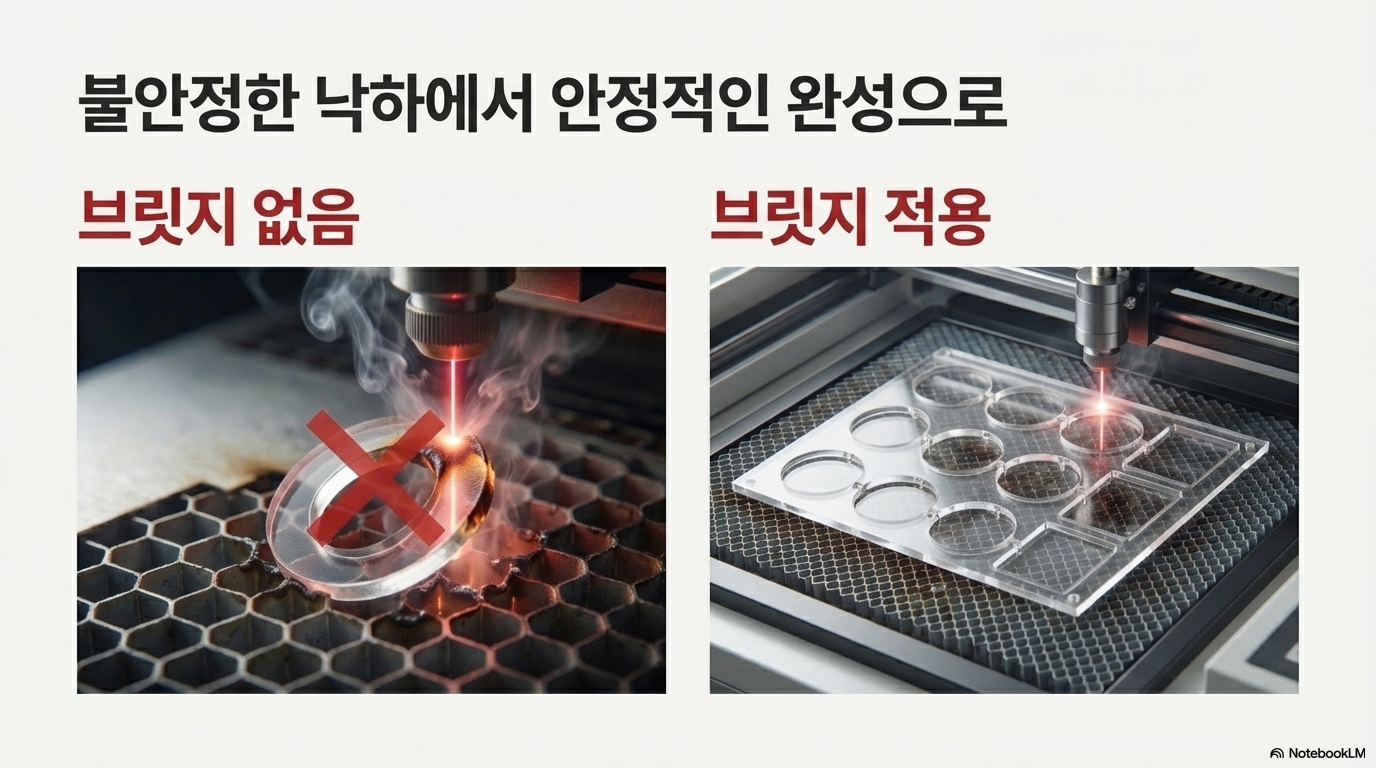 '브리지'란 무엇일까요? 간단히 말해, 절단 경로의 아주 작은 부분을 의도적으로 남겨두어 부품이 완전히 분리되지 않고 작업물에 살짝 붙어있게 만드는 기술입니다.
