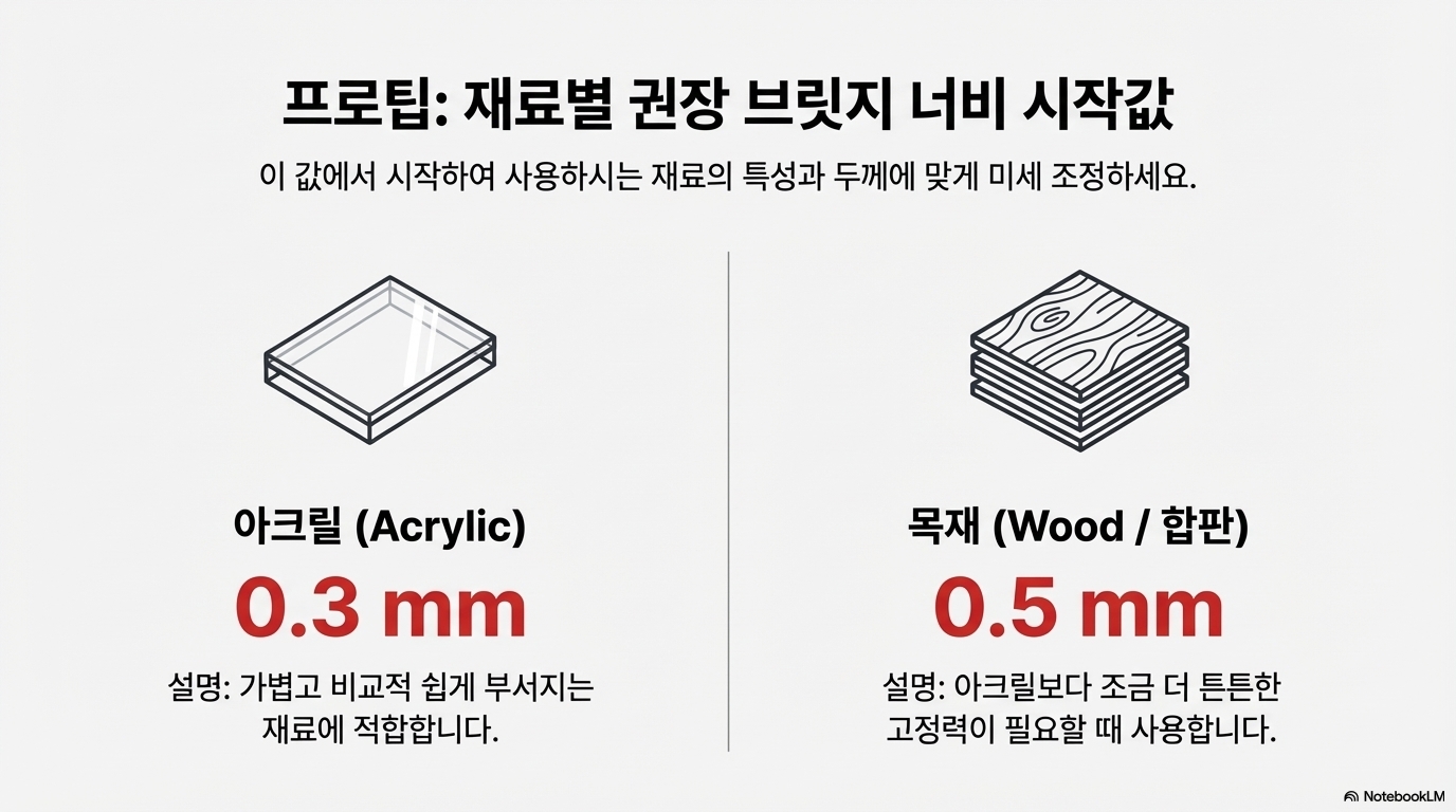 - 적정 너비 설정: 브리지의 너비는 재료에 따라 조절해야 합니다. 좋은 시작점은 다음과 같습니다.