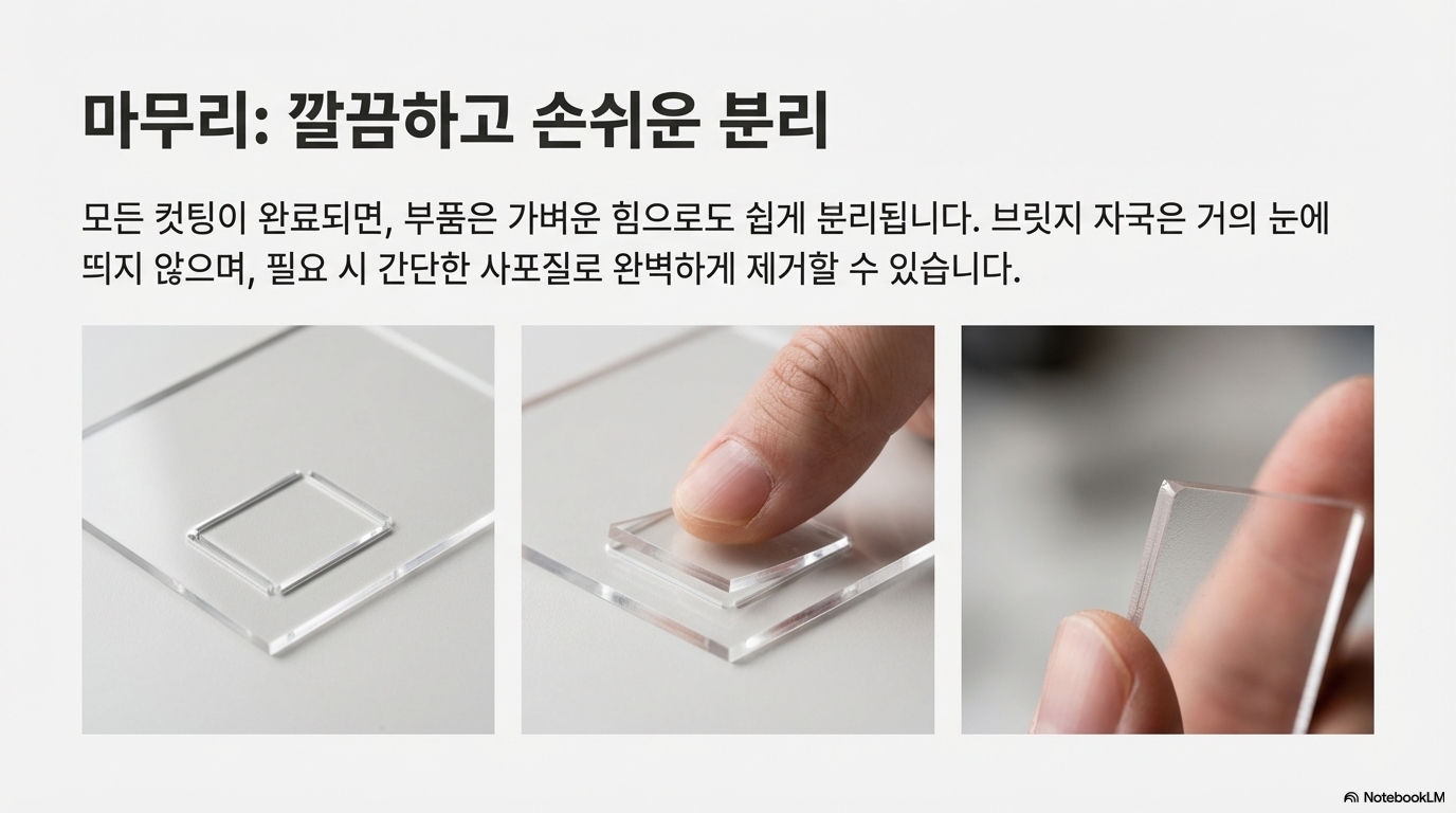 이 기술이 효과적인 이유는 명확합니다. 브리지는 절단된 부품이 제멋대로 떨어져 손상되거나 위치가 바뀌는 것을 원천적으로 막아줍니다. 모든 절단 작업이 끝날 때까지 부품을 원래 자리에 안전하게 고정해 주는 든든한 '다리' 역할을 하는 셈이죠. 작업이 끝나면 아주 작은 연결 부위만 남기 때문에, 손으로 가볍게 떼어내기만 하면 됩니다. 숙련된 메이커들은 브리지를 눈에 잘 띄지 않는 모서리나 직선 구간에 배치하여, 후처리 없이도 거의 티가 나지 않는 완벽한 결과물을 얻어냅니다.