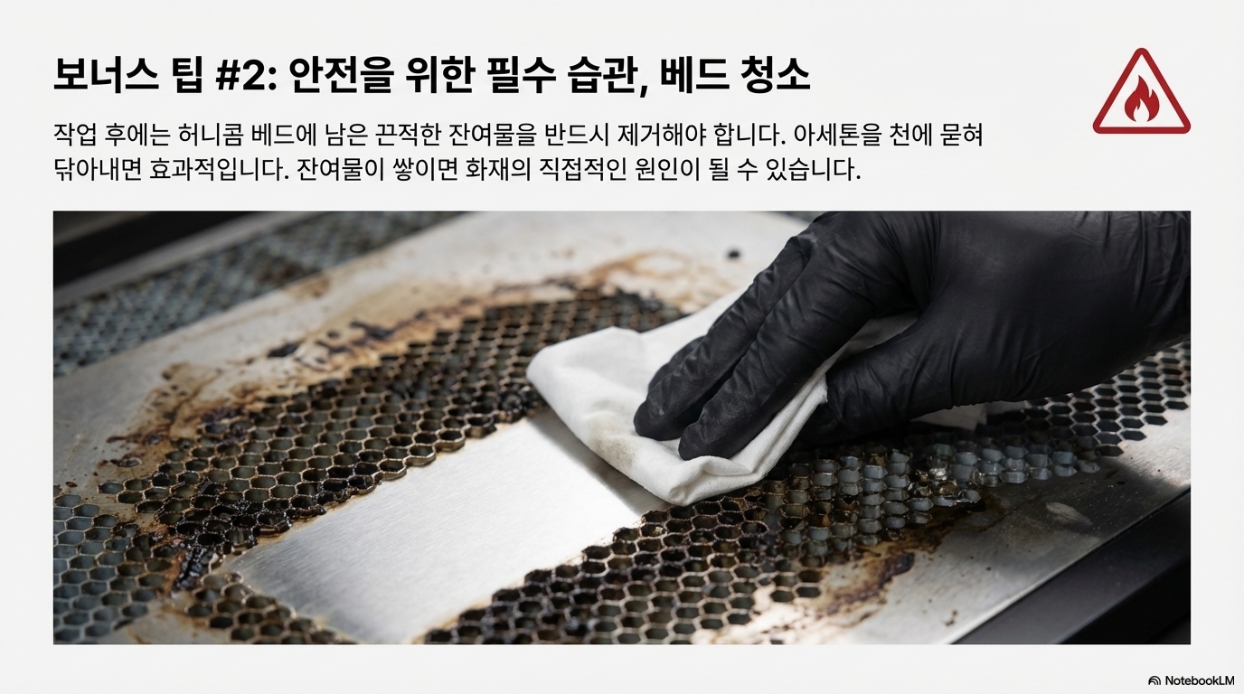 모든 작업의 마무리는 '안전'입니다. 특히 허니콤 베드를 사용하는 경우, 작업대 위에 쌓이는 끈적한 잔여물은 심각한 화재의 원인이 될 수 있습니다. 일반적인 작업대 청소도 중요하지만, 허니콤 베드의 셀 내부에 쌓이는 가연성 잔여물은 특히 위험하므로 주기적으로 관리해야 합니다.