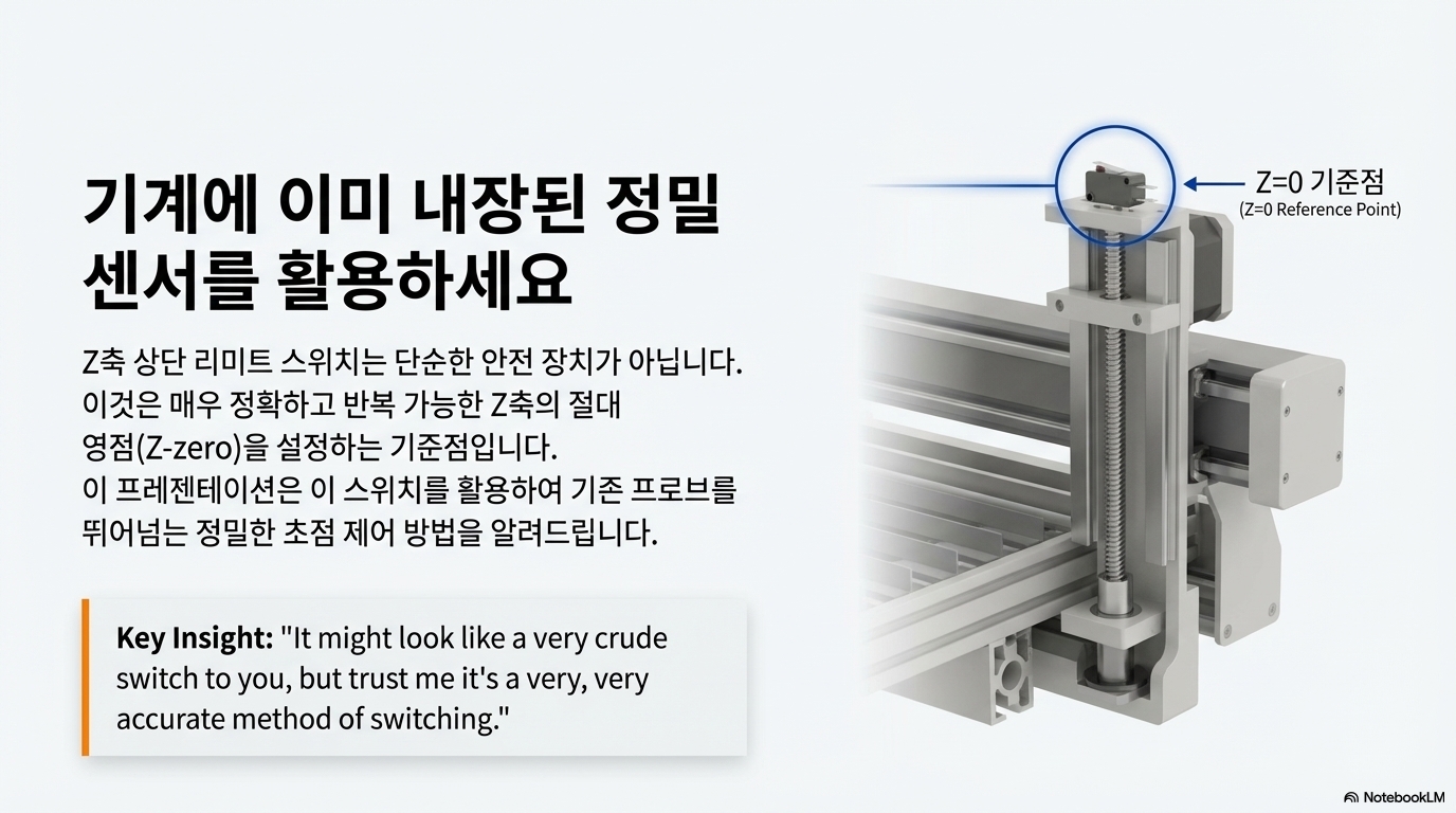 기존의 자동 초점 펜을 완전히 대체할 첫 번째 단계는 바로 기계 Z축 상단에 있는 리미트 스위치를 활용하는 것입니다. 이 스위치를 테이블의 '제로(0)' 기준점으로 설정하면, 파손 위험이 있는 외부 펜보다 훨씬 더 안정적이고 반복 가능한 기준점을 확보할 수 있습니다.