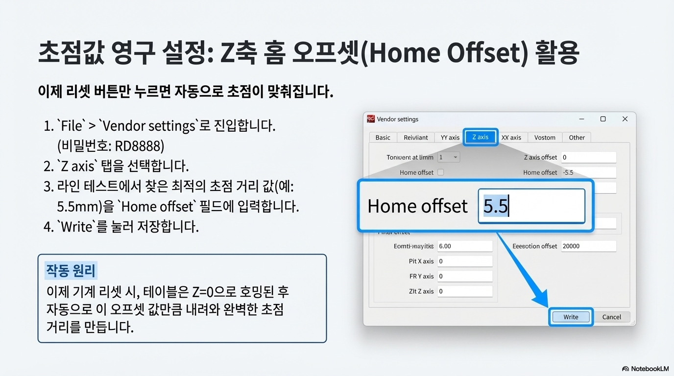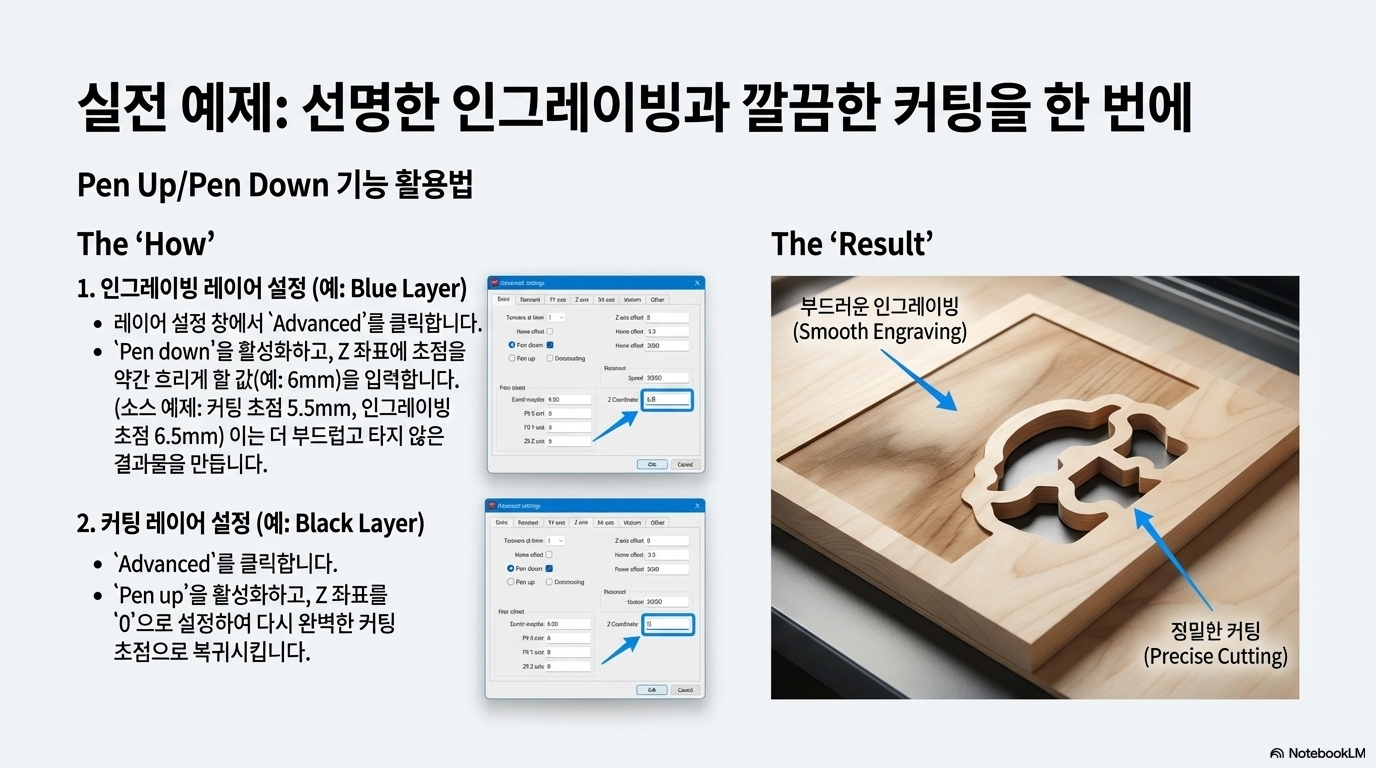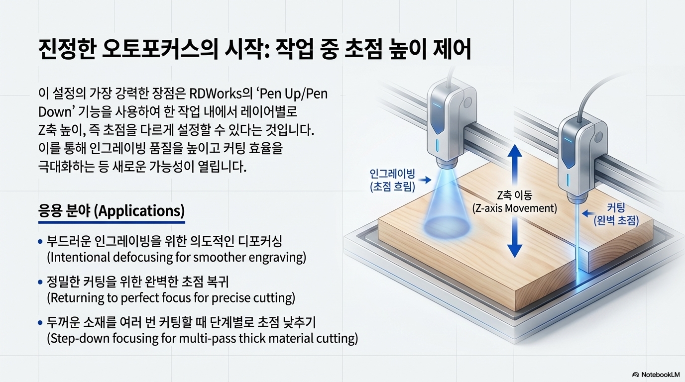 이 글의 핵심이자 가장 놀라운 '아하!'의 순간입니다. 이것은 단순한 팁을 넘어 작업 방식의 혁명입니다. 이제 단 하나의 작업 파일 안에서 조각 레이어와 절단 레이어의 Z축 높이(초점)를 기계가 자동으로 조절하게 만들 수 있습니다. 수동으로 초점을 여러 번 맞춰야 했던 복잡한 작업이 '설정하고 잊어버리는(set-it-and-forget-it)' 완전 자동화 공정으로 탈바꿈하는 순간이죠. 이것이야말로 진정한 의미의 '소프트웨어 자동 초점'입니다.