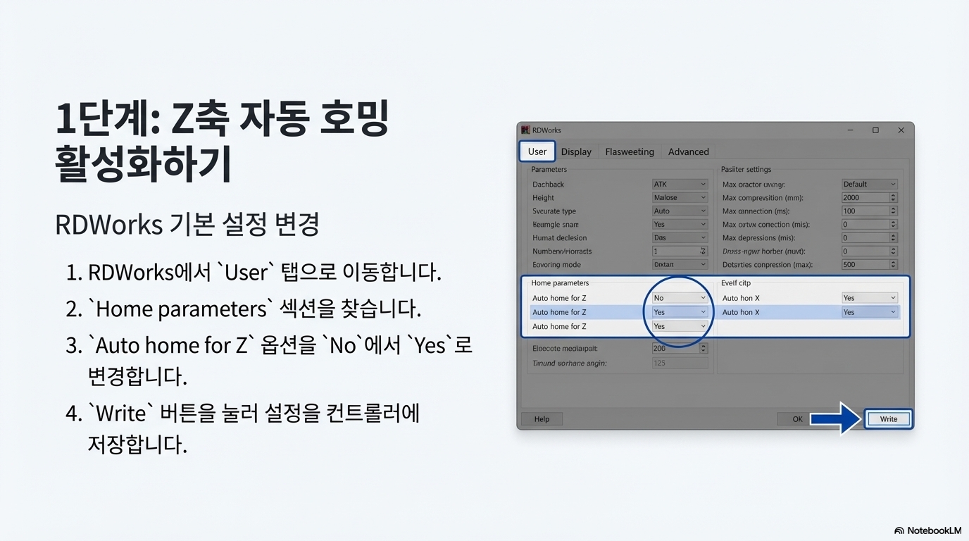 - Z축의 Auto home 옵션을 No에서 Yes로 변경합니다.