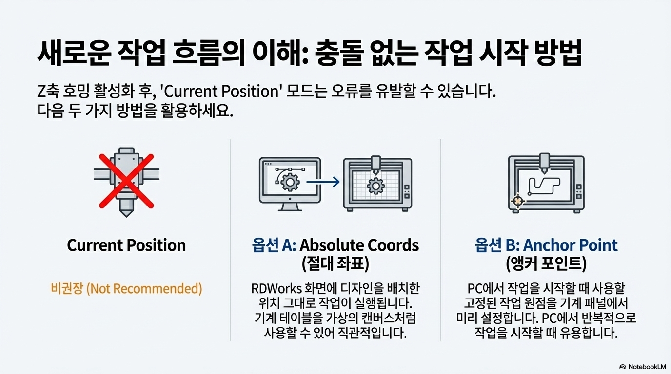 이 설정을 바꾸면, 원점 복귀 동작이 끝난 후 레이저 헤드는 기계의 실제 0,0 위치(보통 좌측 상단 구석)에 안전하게 머무르게 됩니다. 더 이상 예기치 않은 헤드 이동으로 인한 충돌을 걱정할 필요가 없어지며, 작업 준비 과정이 훨씬 더 안전하고 예측 가능해집니다.