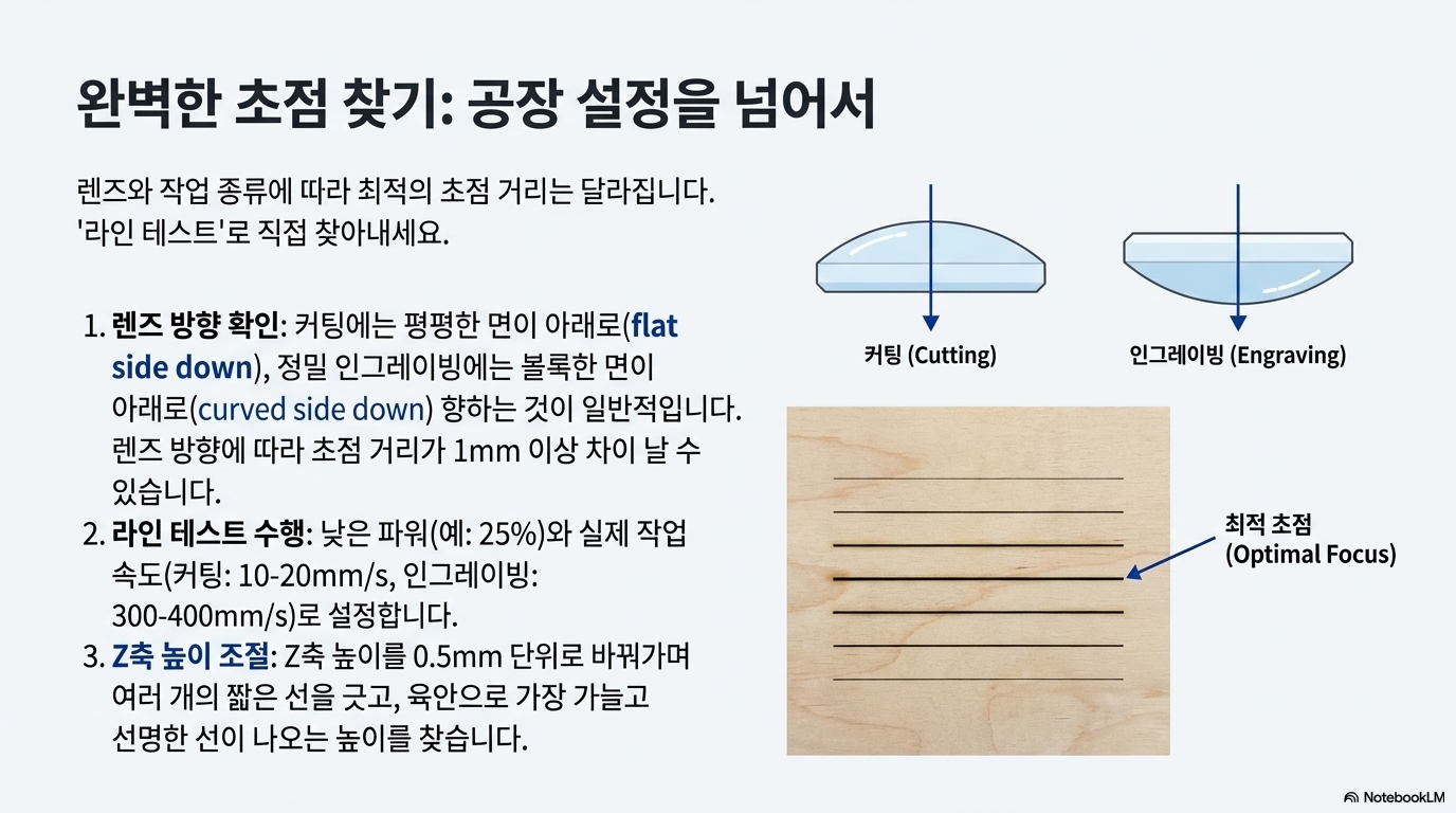 이것이 바로 여러분이 자신의 주된 작업과 해당 작업에서 주로 사용하는 속도에 맞춰 별도의 초점 테스트를 진행해야 하는 이유입니다. 예를 들어, 절단 초점을 찾을 때는 평소 사용하는 절단 속도로, 조각 초점을 찾을 때는 일반적인 조각 속도로 '가는 선 그리기 테스트'를 진행하세요. "완벽한 초점"이란 단 하나의 고정된 값이 아니라, 작업의 종류와 속도에 따라 유동적으로 변하는 값이라는 것을 기억해야 합니다.
