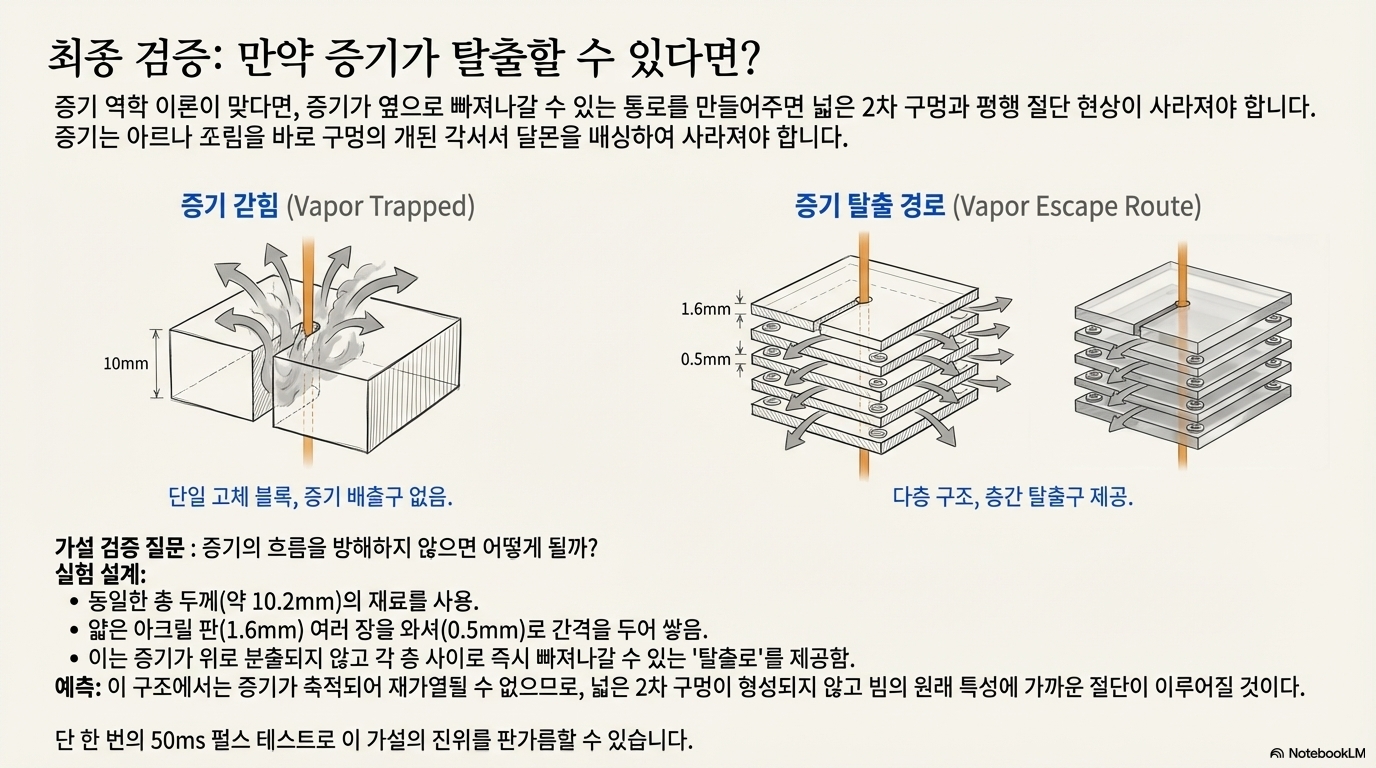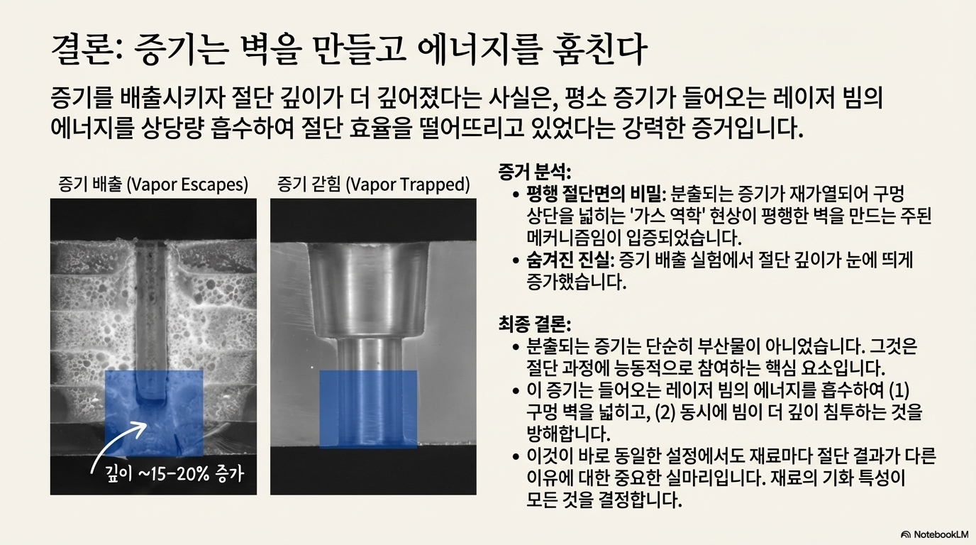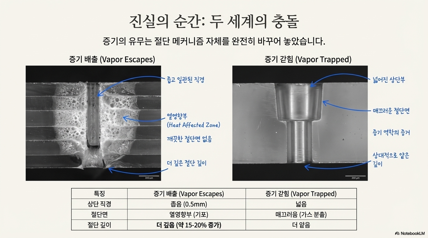 이것만이 아니었습니다. 일반적인 절단면은 깨끗하게 '긁어낸' 듯한 벽을 보인 반면, 틈새가 있는 절단면은 미세한 거품들로 가득 찬 '열 영향부'를 보였습니다. 이것은 결정적 증거였습니다. 탈출하는 증기가 두 가지 역할을 한다는 사실을 증명했기 때문입니다. 첫째, 들어오는 레이저 에너지를 차단하고, 둘째, 그 엄청난 힘으로 절단면의 벽을 물리적으로 깨끗하게 긁어냅니다. 이 증기가 없으면 레이저의 에너지는 그저 주변으로 흩어져 열로 변하며 깨끗한 절단면 대신 거품을 만들어낼 뿐이었습니다.