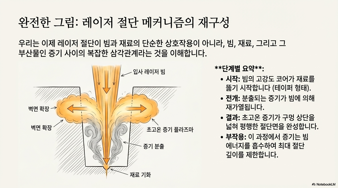 "왜 절단면은 평행할까?"라는 단순한 질문에서 시작된 탐구는, 절단면 내부에서 벌어지는 레이저와 증기 사이의 복잡한 가스 역학이라는 거대한 세계를 드러냈습니다. 에너지의 '뾰족한 끝'이 절단을 주도하고, 빠져나가는 증기가 그 과정을 방해하며 최종적인 절단면의 형태를 만든다는 사실을 알게 된 것입니다.