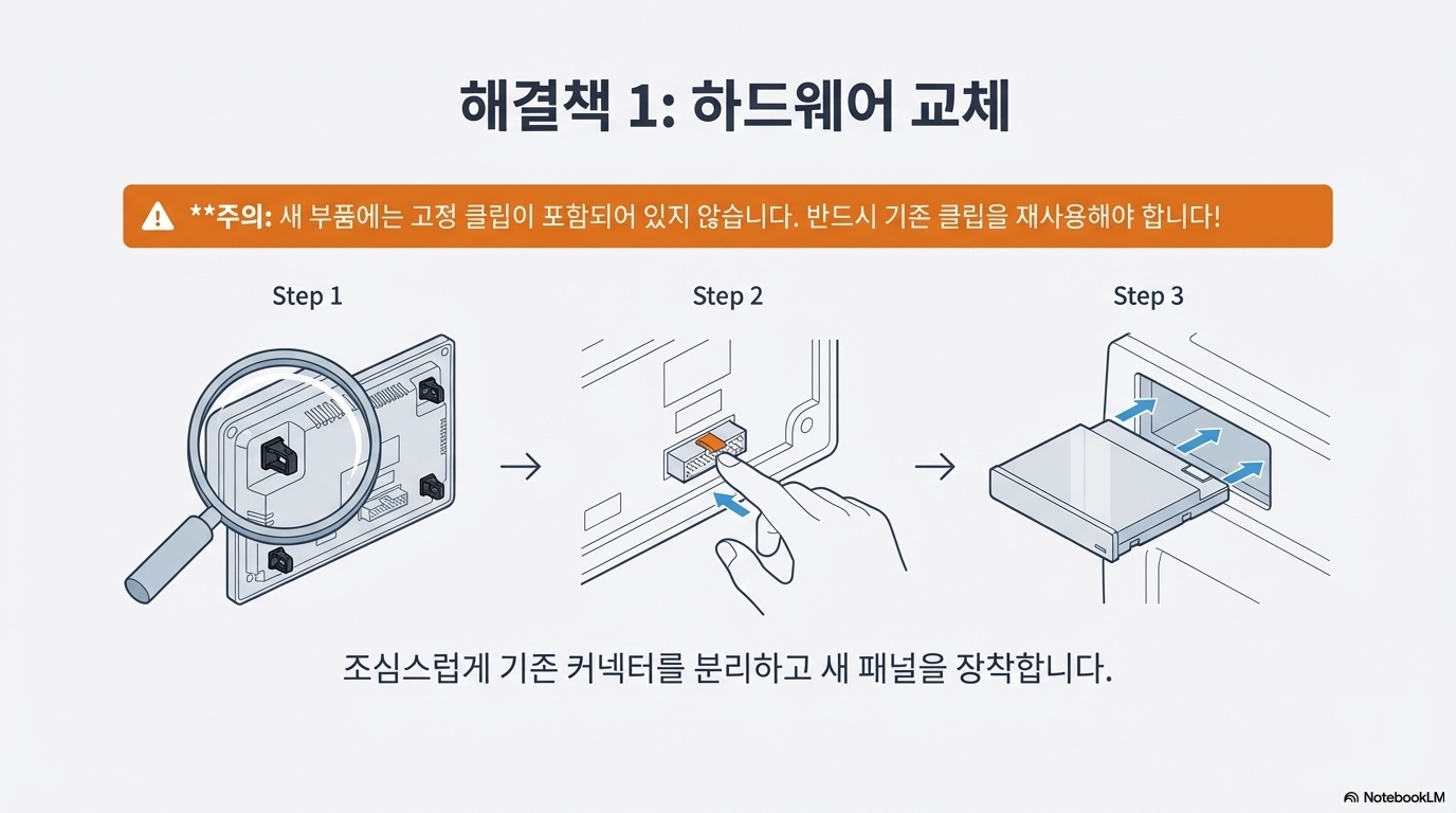 여기서 한 가지 중요한 팁이 있습니다. 새로 주문한 부품에는 패널을 고정하는 데 필요한 마운팅 클립이 포함되어 있지 않습니다. 따라서 기존 부품에서 클립을 반드시 떼어내어 보관해야 합니다. 이 작은 부품이 없으면 설치를 마무리할 수 없으니 절대 잊지 마세요.