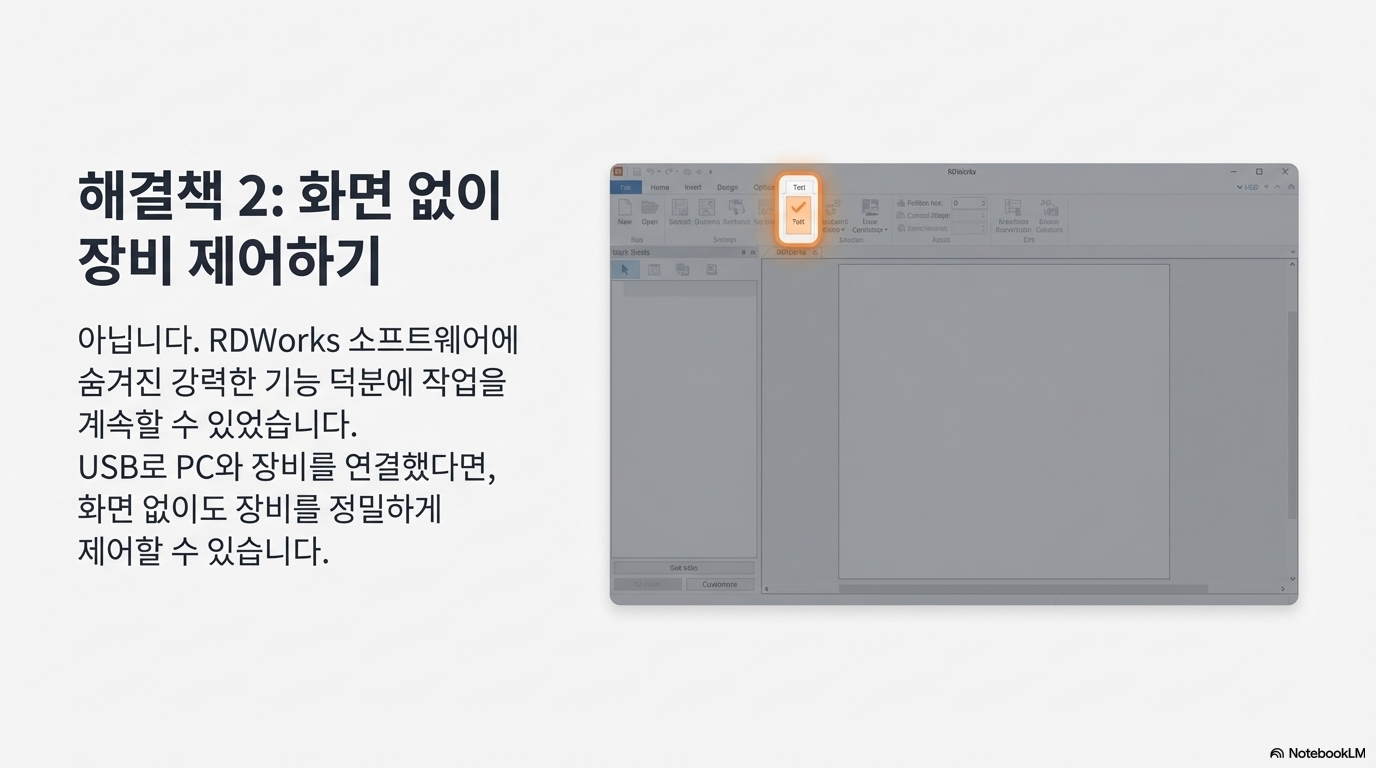 여기서 가장 놀라운 사실을 발견했습니다. 저는 화면이 고장 난 상태에서도 무려 2주 동안이나 레이저 커터를 계속 사용할 수 있었습니다. 어떻게 그게 가능했을까요? 바로 RDWorks 소프트웨어의 'Test' 탭 덕분이었습니다.