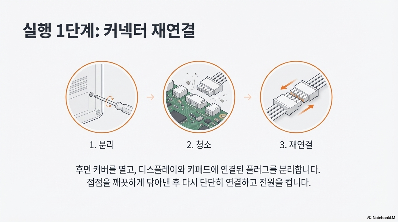 문제가 생겼을 때 가장 먼저 하는 일은 인터넷을 검색하는 것입니다. 많은 사람들이 디스플레이 패널의 플러그를 뽑아 깨끗하게 닦은 뒤 다시 연결하면 해결될 것이라고 조언했습니다. 저도 그 말을 믿고 시도해봤지만, 결과는 마찬가지였습니다. 혹시나 해서 키패드 필름에 연결되는 별도의 커넥터까지 확인하며 모든 간단한 해결책을 시도해봤지만, 화면은 여전히 먹통이었죠.