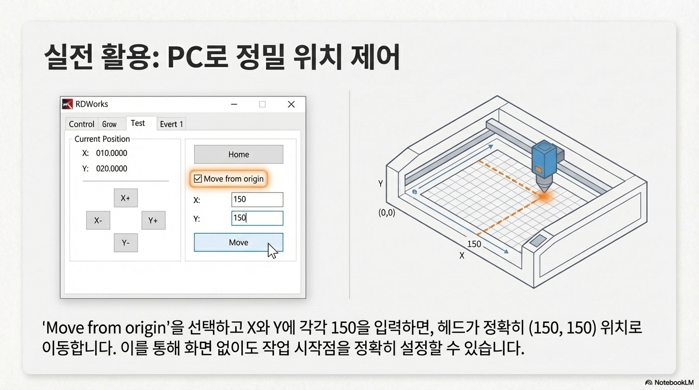 - 현재 위치 확인: 레이저 헤드의 현재 X/Y 좌표를 확인할 수 있습니다. (작업 시작점의 좌표를 기록해 둘 때 유용합니다).
