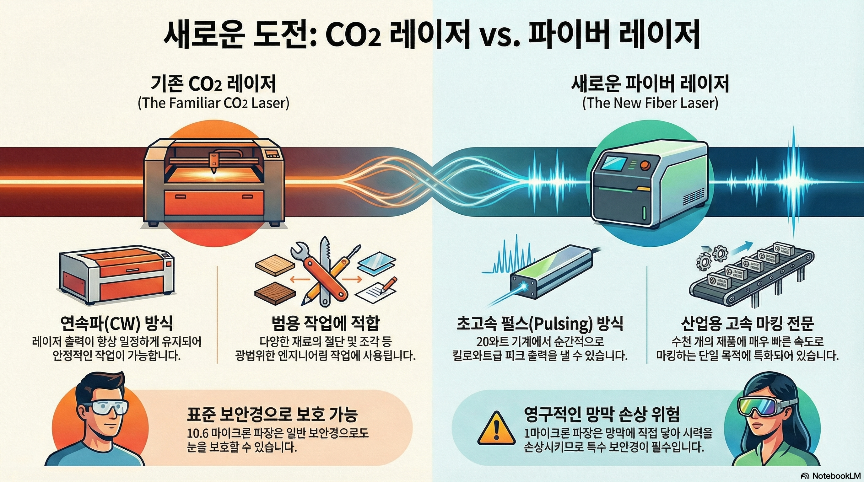 파이버 레이저를 다룰 때 가장 중요하고도 무서운 사실입니다. CO2 레이저의 파장은 10.6마이크론인 반면, 파이버 레이저의 파장은 1마이크론으로 훨씬 짧습니다. 이 1마이크론 파장의 빛은 우리 눈의 각막이나 수정체에서 걸러지지 않고 그대로 통과하여 망막에 직접 도달합니다. 이는 영구적인 시력 손상을 유발할 수 있음을 의미합니다. 따라서 파이버 레이저를 사용할 때 전용 보안경 착용은 단순한 권장 사항이 아니라, 시력을 지키기 위한 절대적인 필수 조치입니다.