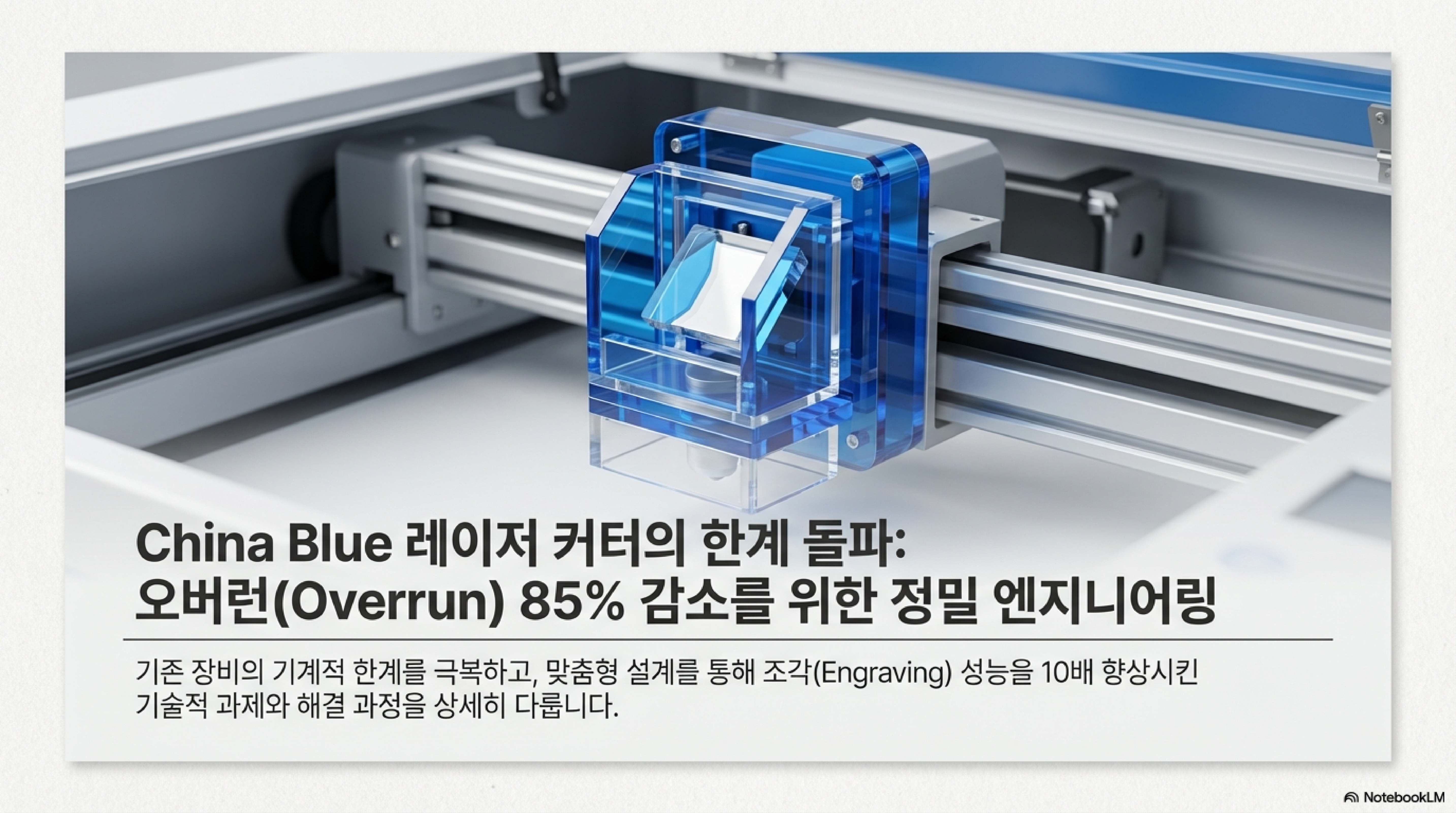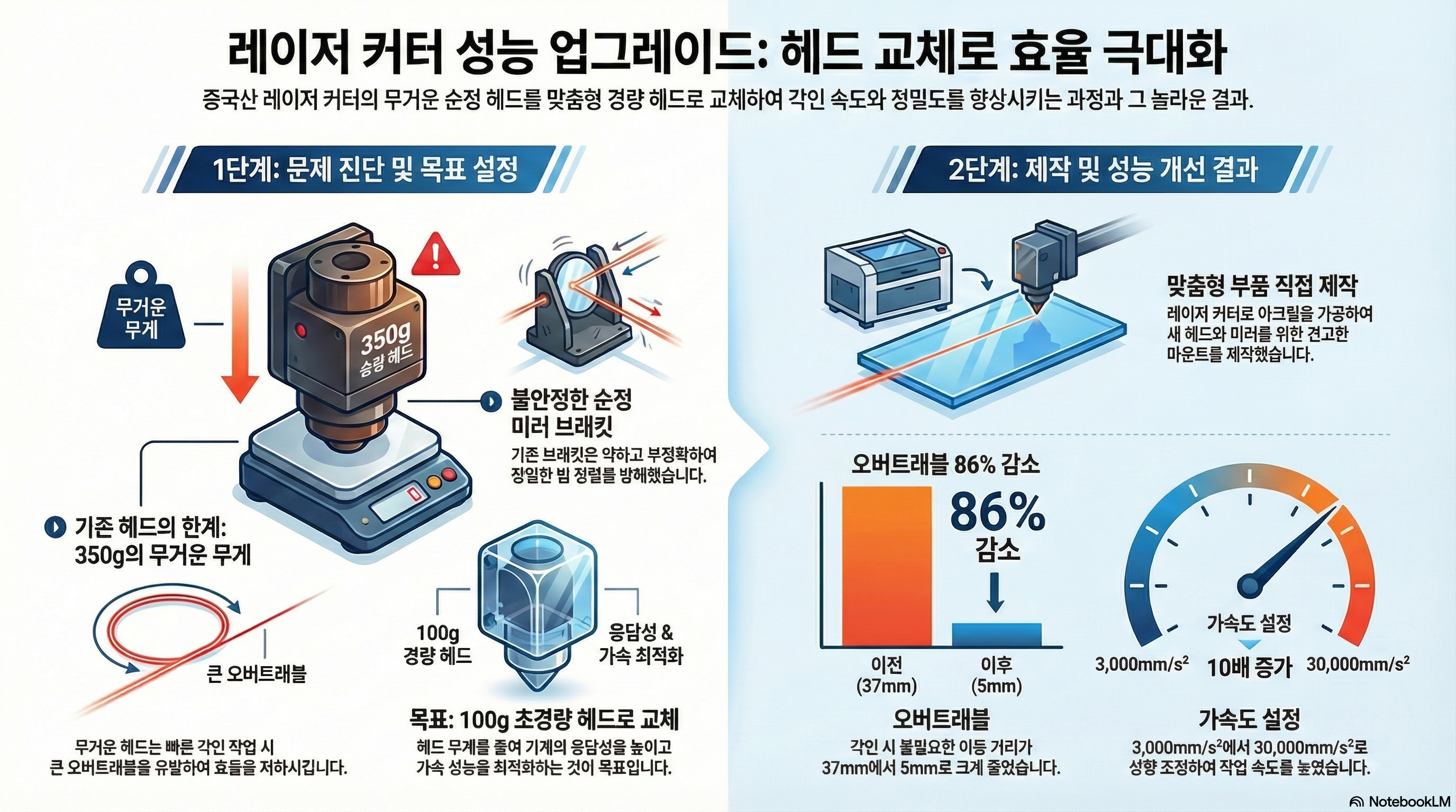저렴한 '중국산 블루' 레이저 커터의 성능을 조금이라도 더 끌어올리고 싶은 마음, 우리 모두가 한 번쯤은 품어봤을 겁니다. 저 역시 그랬습니다. 처음의 계획은 아주 소박했죠. 무거운(350g) 레이저 헤드를 가벼운(100g) 것으로 교체해 고속 각인 시 발생하는 오버트래블(over-travel)을 줄여보려는, 그저 간단한 부품 교체 프로젝트였습니다. 하지만 이 작은 시작은 기계의 근본적인 잠재력을 깨우는 예상치 못한 여정으로 저를 이끌었습니다. 이 과정에서 저는 하드웨어의 한계를 뛰어넘는 놀라운 사실들을 발견했고, 그 여정에서 얻은 통찰을 여러분과 나누고자 합니다.