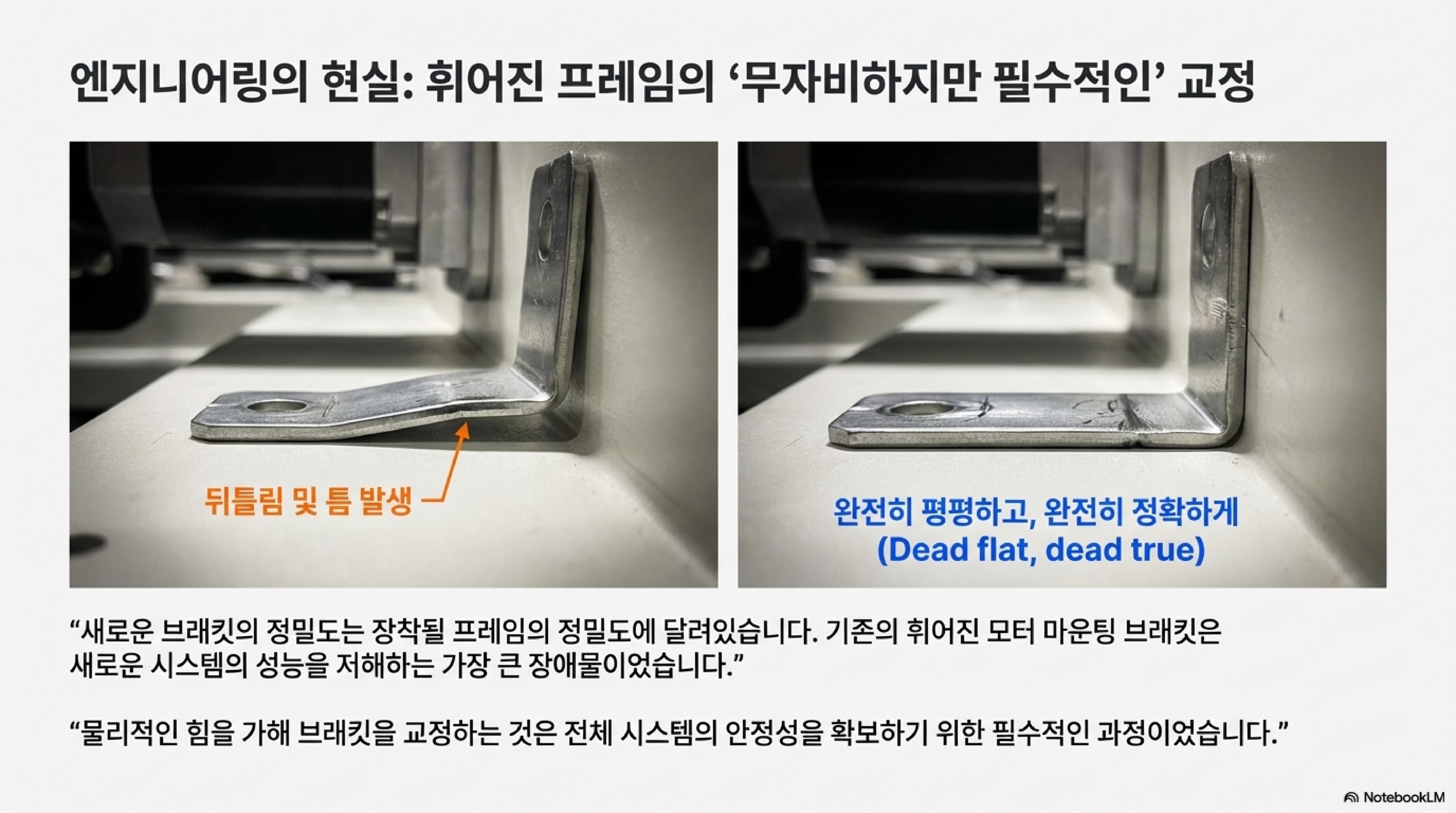 이 총체적 난국을 어떻게 해결했을까요? 복잡한 지그를 설계하거나 정밀 측정을 한 것이 아닙니다. 저는 물리적인 힘을 사용해 휘어진 브래킷을 "꽤나 난폭하게(quite a bit brutal)" 펴냈습니다. 놀랍게도 이 방법은 완벽하게 통했고, 브래킷은 "완벽하게 평평하고(dead flat, dead true)" 올바른 상태가 되었습니다. 이는 저가형 장비를 다룰 때, 섬세한 조정만으로는 해결할 수 없는 근본적인 설계 결함을 마주하게 된다는 사실을 보여줍니다. 때로는 문제의 핵심을 파고드는 과감하고 실용적인 해결책이 더 효과적일 수 있다는 중요한 교훈이었습니다.