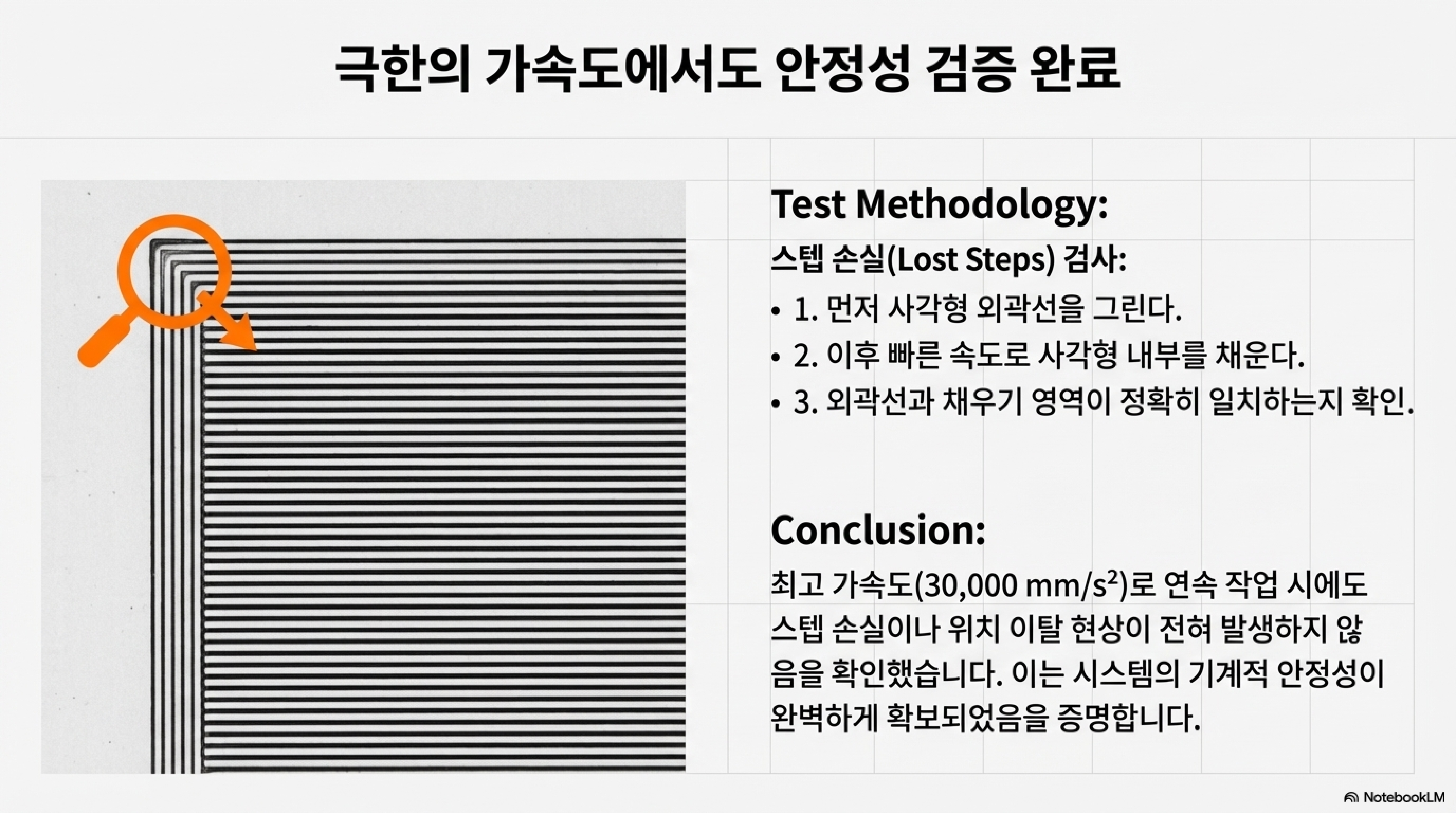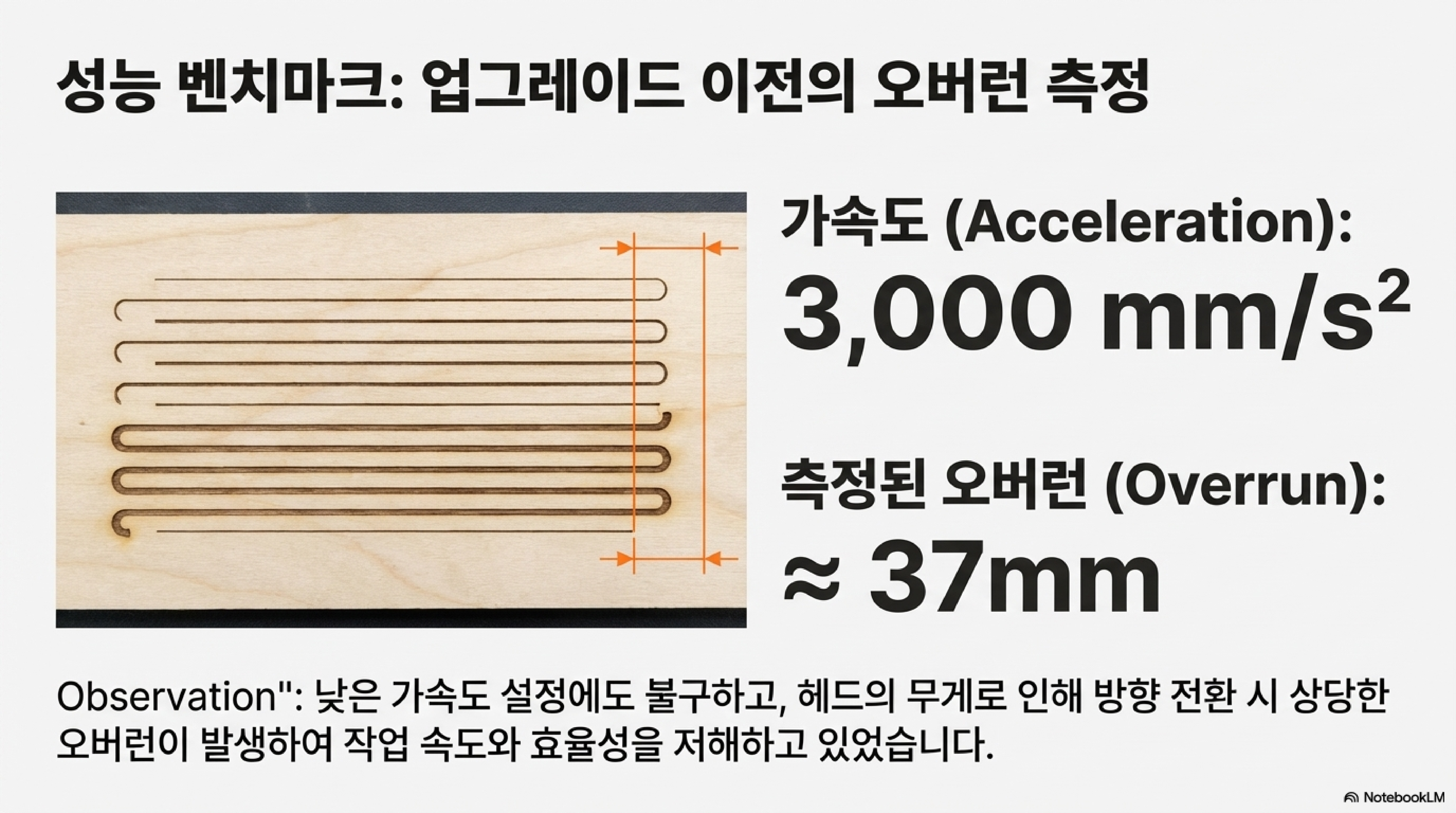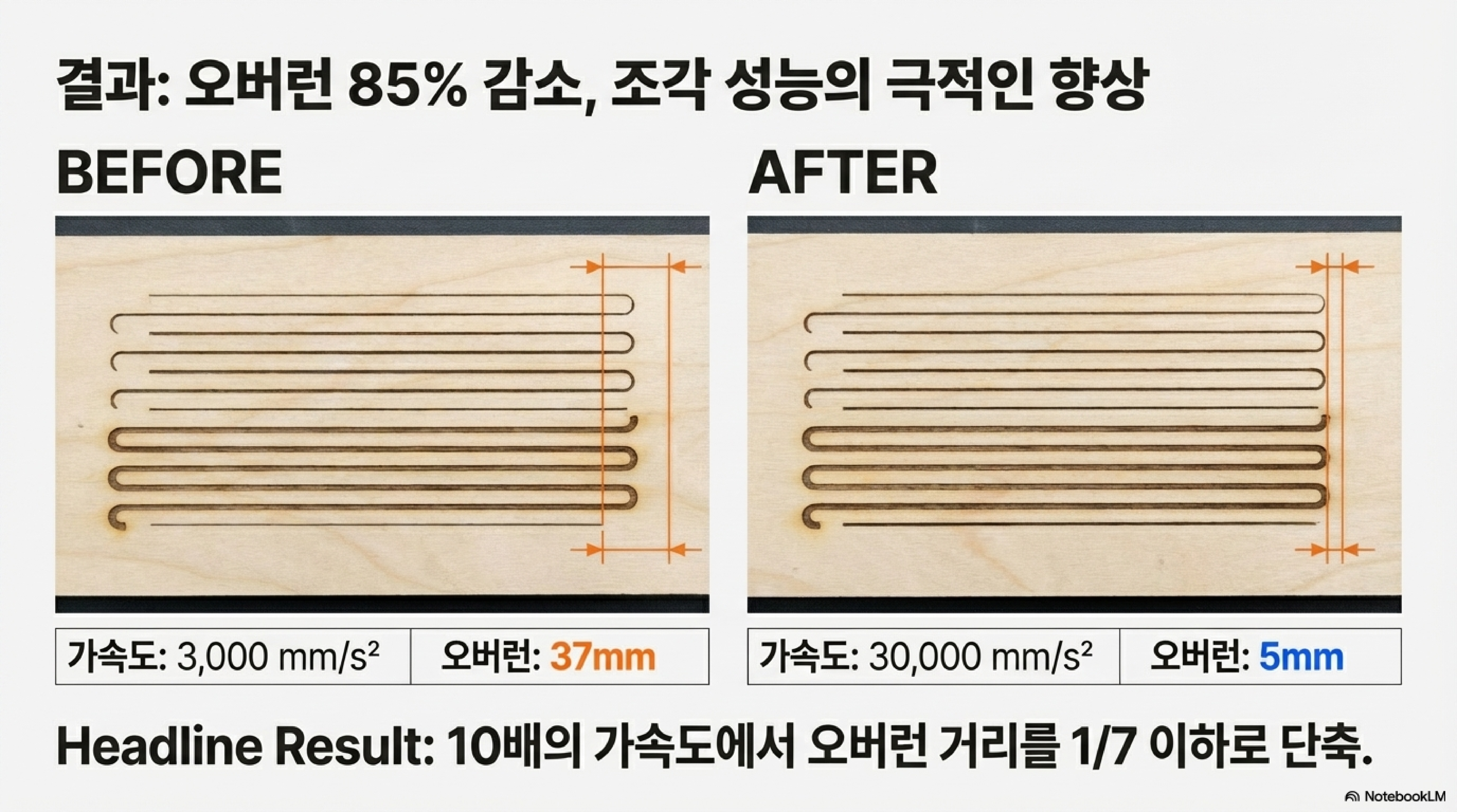 결과는 상상 이상이었습니다. 이 단 하나의 설정 변경으로 37mm에 달하던 오버트래블은 단 5mm로 극적으로 줄어들었습니다. 이는 약 7배의 작업 효율성 향상을 의미합니다. 더욱 놀라운 점은, 이렇게 급격한 설정 변경에도 불구하고 스텝 모터가 단계를 놓치는 '스텝 손실(lost steps)' 현상 없이 완벽하게 작동했다는 것입니다. 이것이야말로 가벼운 헤드라는 하드웨어 개선이 뒷받침되었기에 가능한 일이었습니다. 하드웨어는 잠재력을 만들고, 소프트웨어 설정은 그 잠재력을 해방시키는 열쇠였던 셈입니다. 이 발견은 우리에게 중요한 교훈을 줍니다. 기계의 한계는 물리적인 부품이 아니라, 우리가 감히 도전하지 않았던 소프트웨어 설정에 있을 수 있다는 것을요.