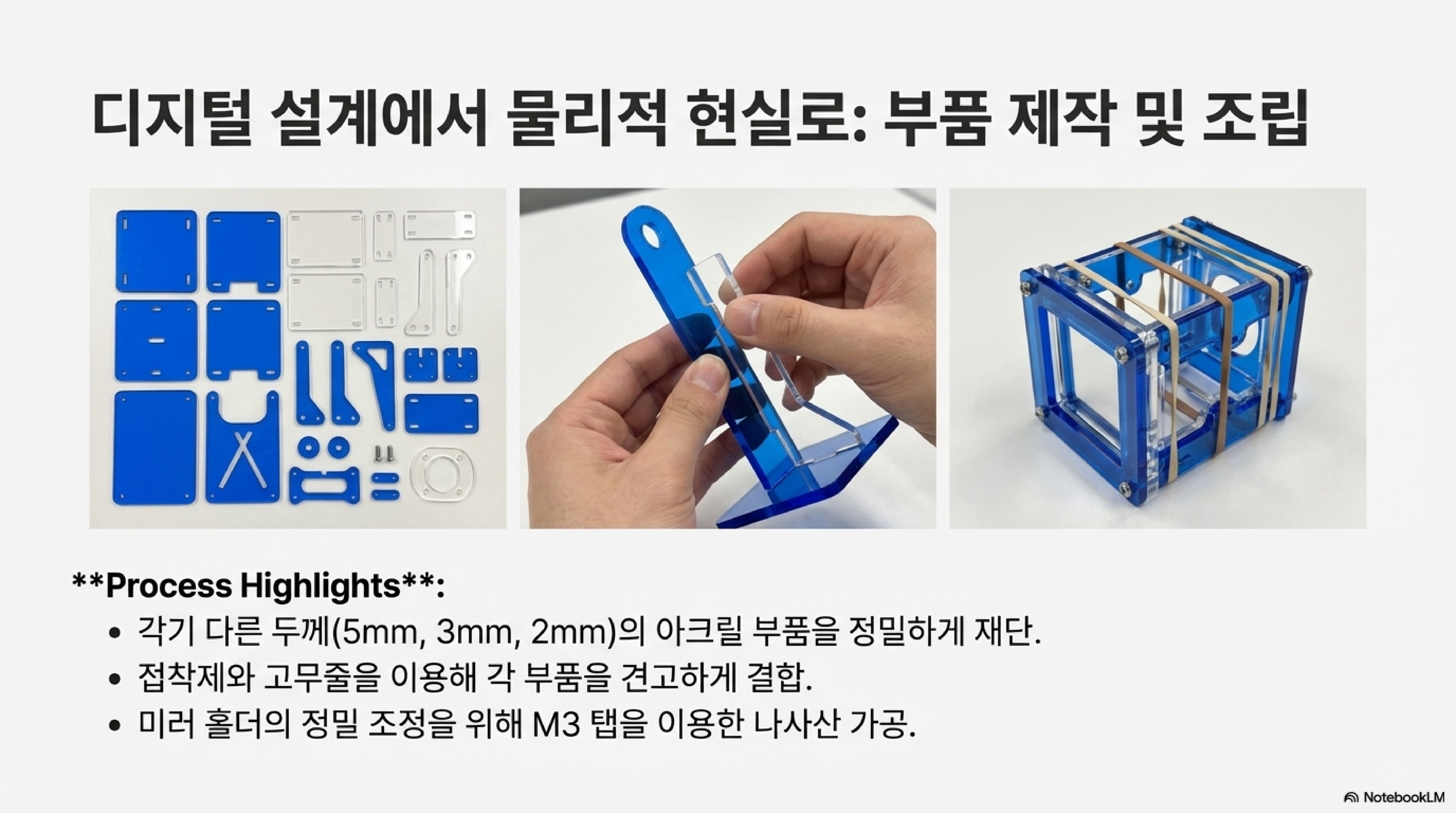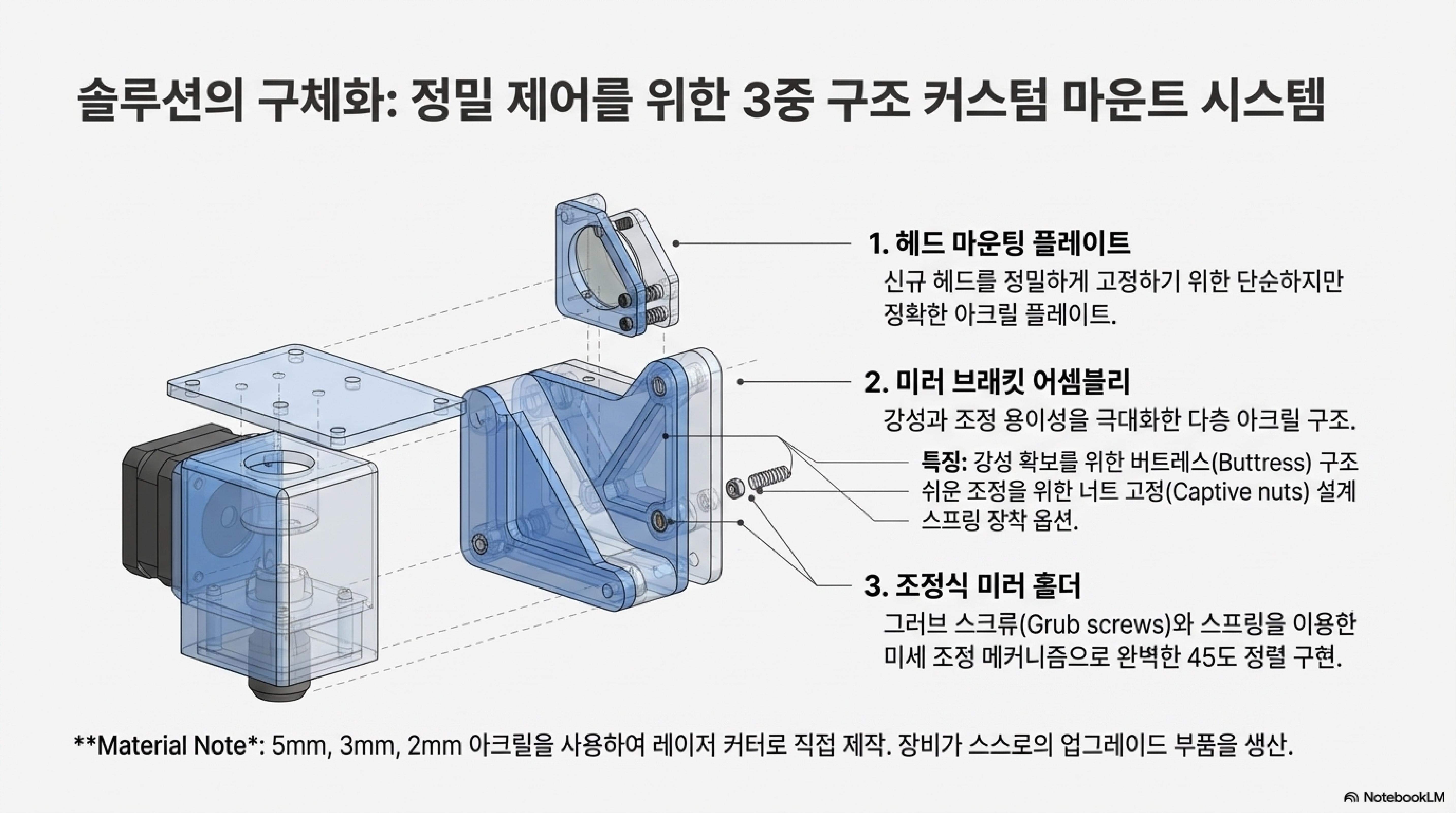 그래서 저는 직접 만들기로 했습니다. 제 레이저 커터를 사용해 5mm 아크릴, 2mm 아크릴, 3mm 합판 등 여러 재료를 잘라 여러 조각이 맞물리는 복잡한 구조의 맞춤형 미러 마운트를 설계했습니다. 여러 조각을 접착제와 고무줄로 고정하며 조립하는 과정은 마치 3D 퍼즐을 맞추는 작은 엔지니어링 프로젝트와 같았습니다.