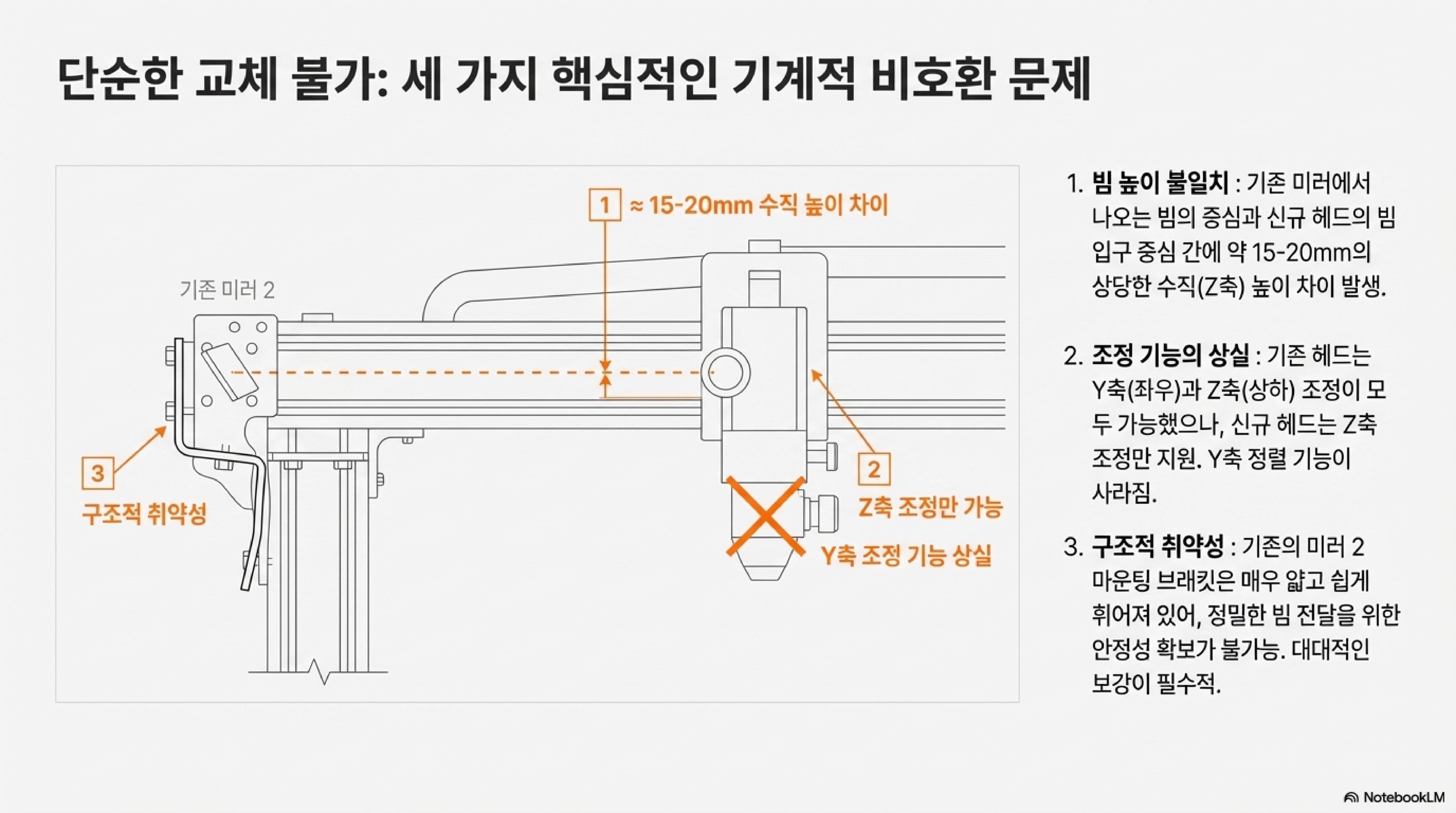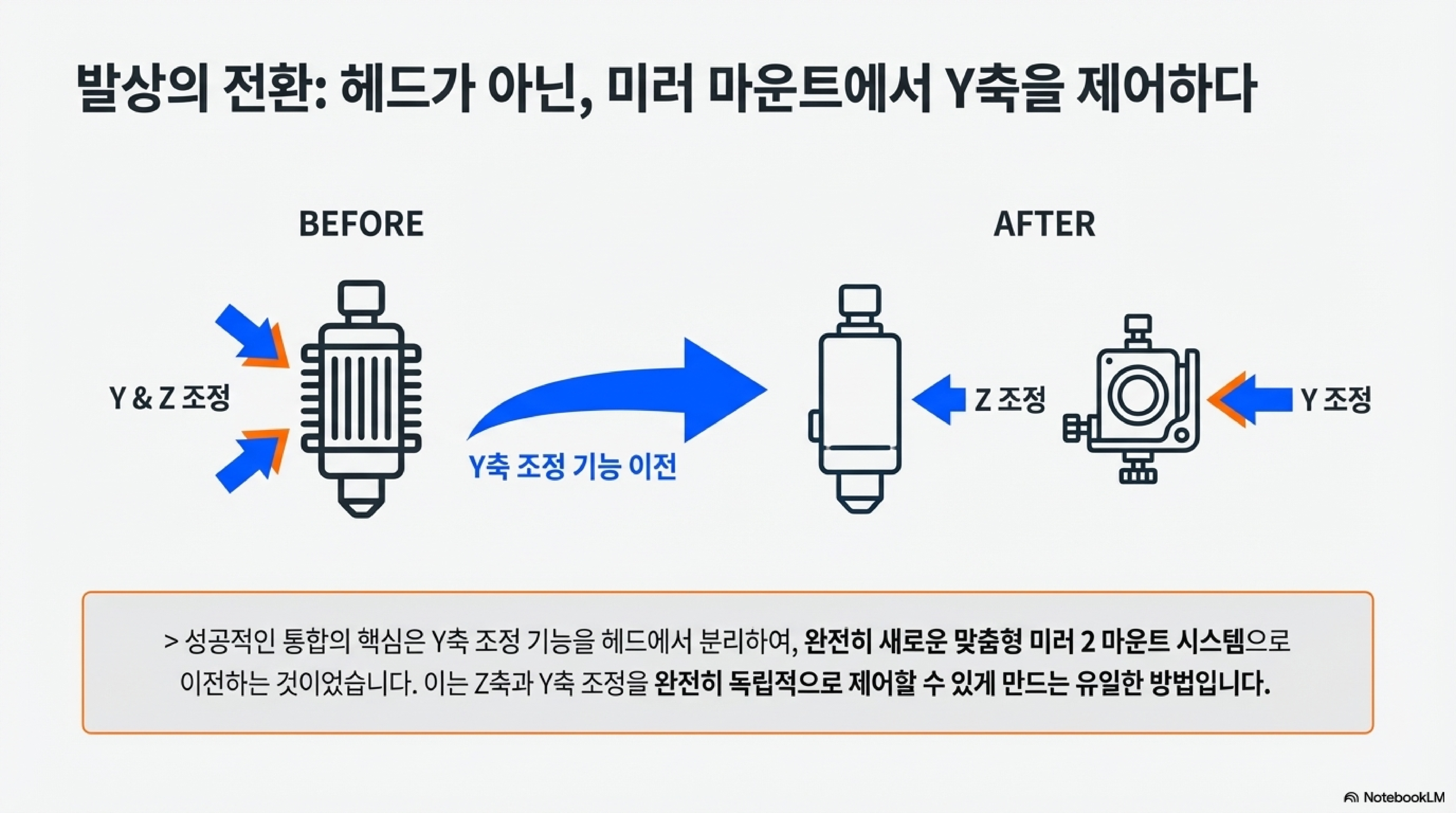 이번 업그레이드는 단순한 부품 교체가 아니었습니다. 새 헤드는 Y축 조절 기능이 없었기 때문에, 기존 미러 마운트와 호환되지 않았을 뿐만 아니라 미러 마운트에서 모든 정밀 조정을 구현해야 하는 새로운 과제가 생겼습니다. 기성품으로는 해결할 수 없는 문제였죠.
