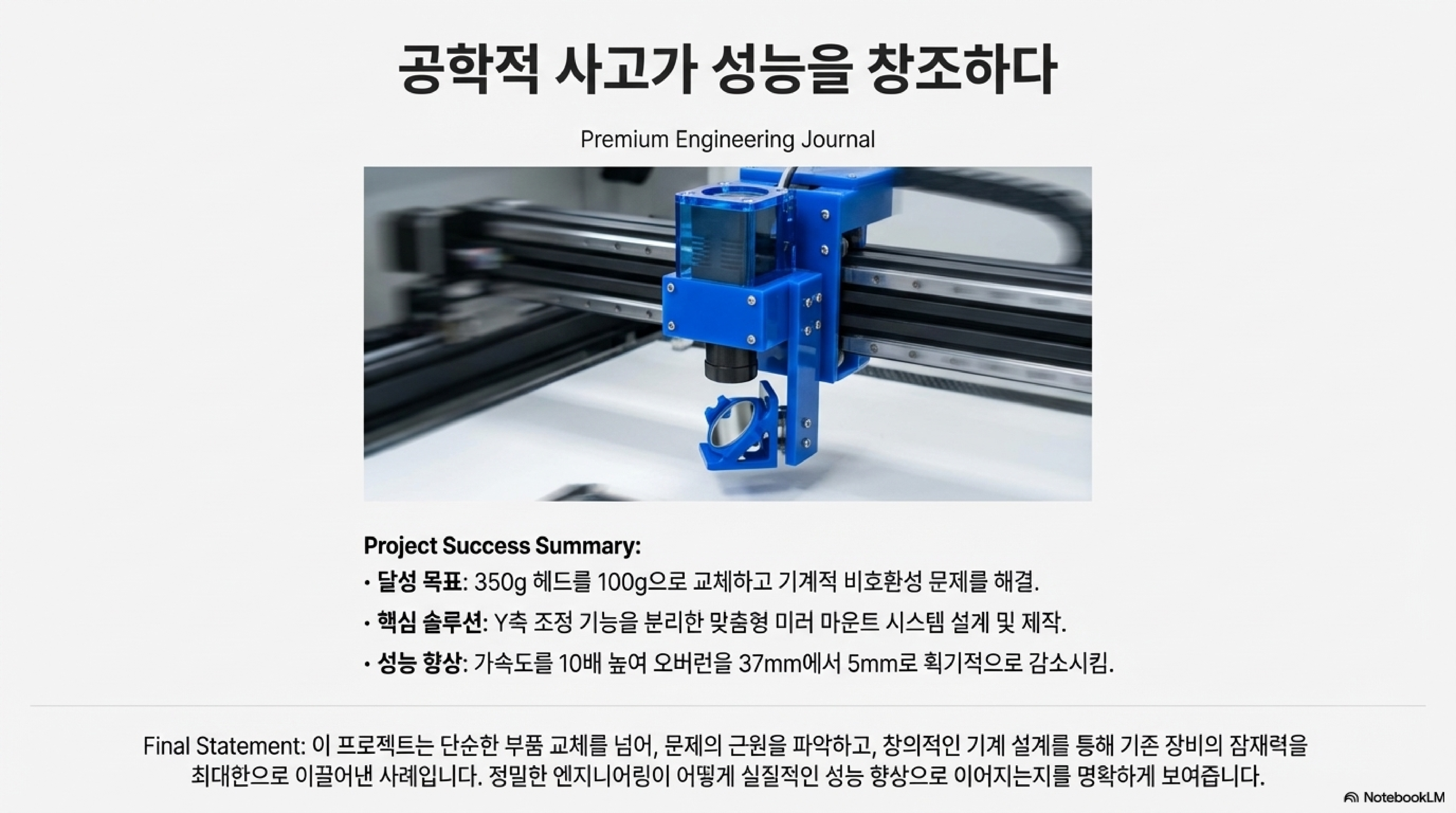 이번 업그레이드 여정은 단순한 부품 교체를 넘어, 기계에 숨겨진 잠재력을 최대한으로 끌어내는 과정이었습니다. 최고의 결과는 값비싼 하드웨어만으로 얻어지는 것이 아니었습니다. 가벼운 헤드라는 하드웨어 개선, 가속도라는 소프트웨어 설정의 최적화, 그리고 직접 부딪히고 해결하려는 실용적인 DIY 기술이 결합되었을 때 비로소 진정한 성능 향상이 가능했습니다.