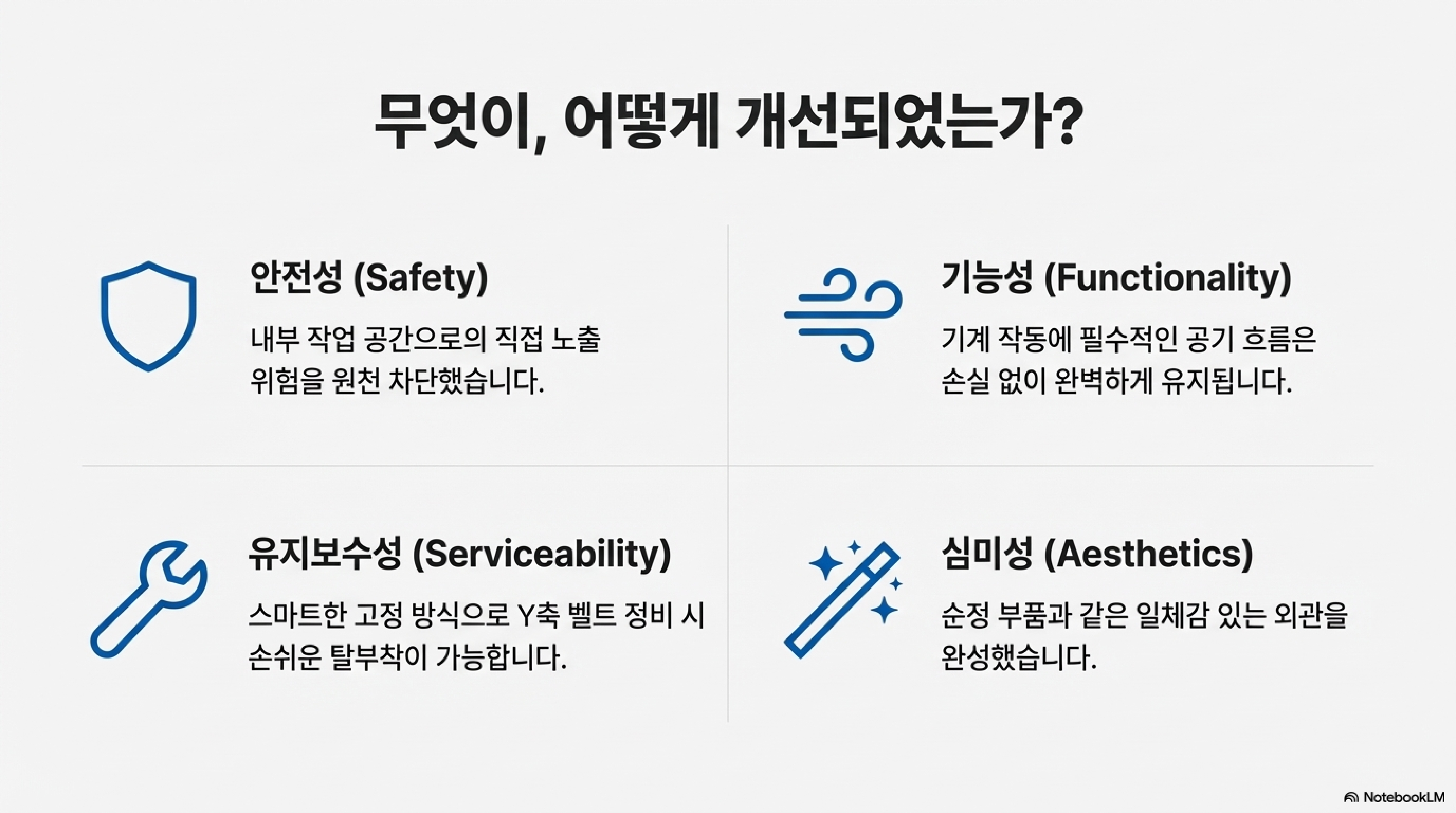 이 기계의 근본적인 문제는 설계 자체에 있었습니다. 원활한 공기 흐름을 확보하기 위해 기계 덮개를 반드시 열어두어야만 했던 것입니다. 이는 사용자를 잠재적인 위험으로부터 보호하기 위해 덮개를 닫고 작동해야 한다는 기계 안전의 기본 원칙과 정면으로 충돌하는 문제입니다.