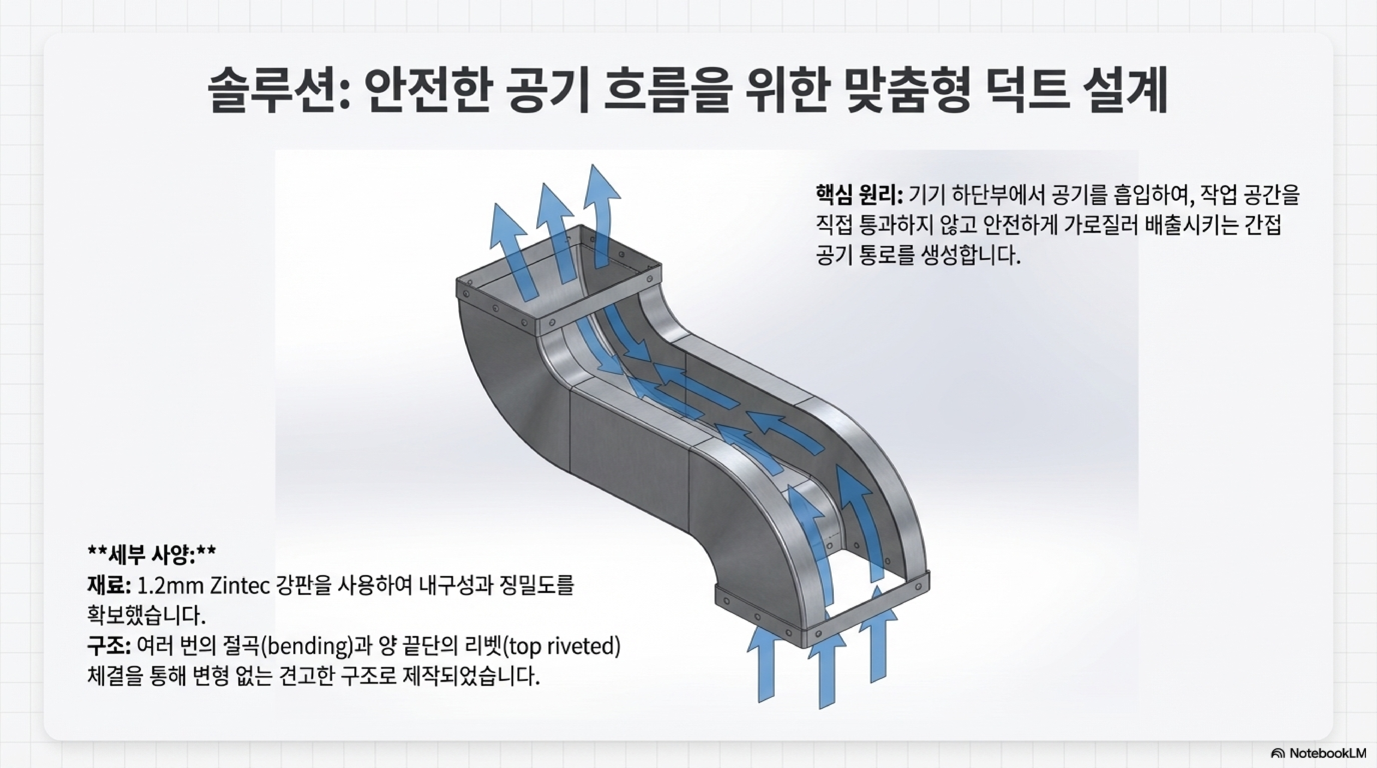 제작자는 복잡한 전자 장치나 소프트웨어가 아닌, 우아하고 단순한 기계적 해결책을 고안했습니다. 그는 기계 도어의 플랜지(flange) 일부를 잘라낸 후, "1.2 zintec 소재"를 사용해 맞춤형 공기 덕트를 제작했습니다. 이 부품은 양 끝에 팝 리벳(pop rivet) 하나씩만을 사용하여 미니멀하면서도 견고하게 조립되었습니다.