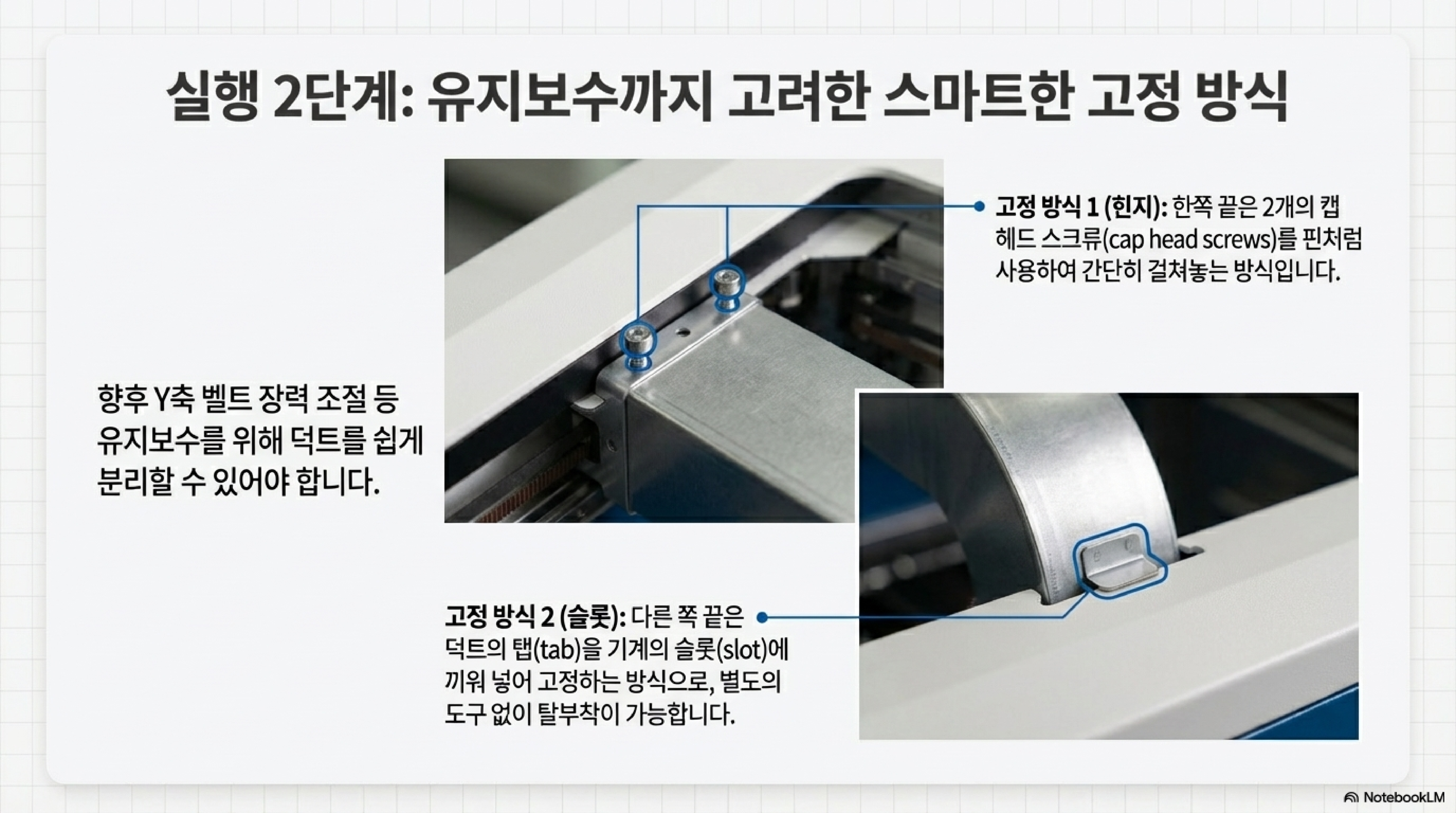 새로 만든 부품은 기계 아래쪽에서 공기를 끌어와 내부로 공급하는 독창적인 구조를 가집니다. 덕분에 덮개를 안전하게 닫은 상태에서도 공기 흐름 문제를 완벽하게 해결할 수 있었습니다. 장착 방식 또한 매우 영리합니다. 한쪽 끝은 캡 헤드 나사로 만든 핀에 꽂고(plug it on), 다른 쪽 끝은 작은 탭 위로 살짝 젖혀 고정(flip it on)하는 방식입니다. 이로써 별도의 도구 없이도 유지보수를 위해 쉽게 탈부착할 수 있습니다. 3D 프린팅이나 복잡한 센서를 추가하는 대신 금속을 자르고 구부리는 전통적인 가공 기술이 얼마나 강력하고 우아한 해결책이 될 수 있는지 명확히 보여주는 사례입니다.