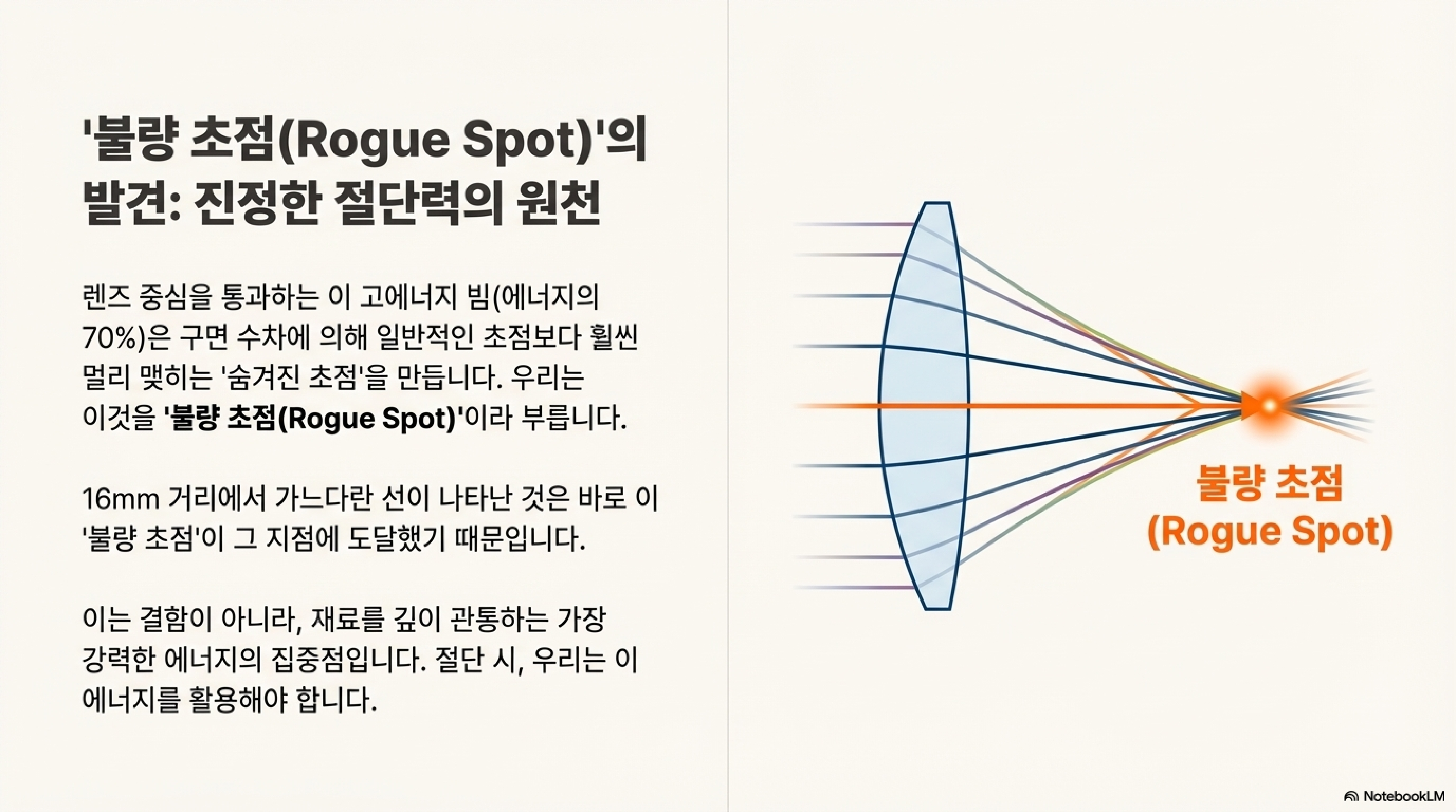 - 가우시안 빔(Gaussian Beam): 레이저 빔의 에너지는 균일하지 않습니다. 빔 중앙 약 1/3 직경 내에 전체 에너지의 70%가량이 집중되어 있는 '가우시안 분포'를 따릅니다. 즉, 빔의 중심에는 매우 강력한 에너지 스파이크가 존재합니다. 바로 이 강력한 중앙부 에너지가 렌즈의 중심축을 통과하며, 구면 수차의 영향을 덜 받는 긴 초점의 '로그 빔(rogue beam)'을 만들어냅니다.