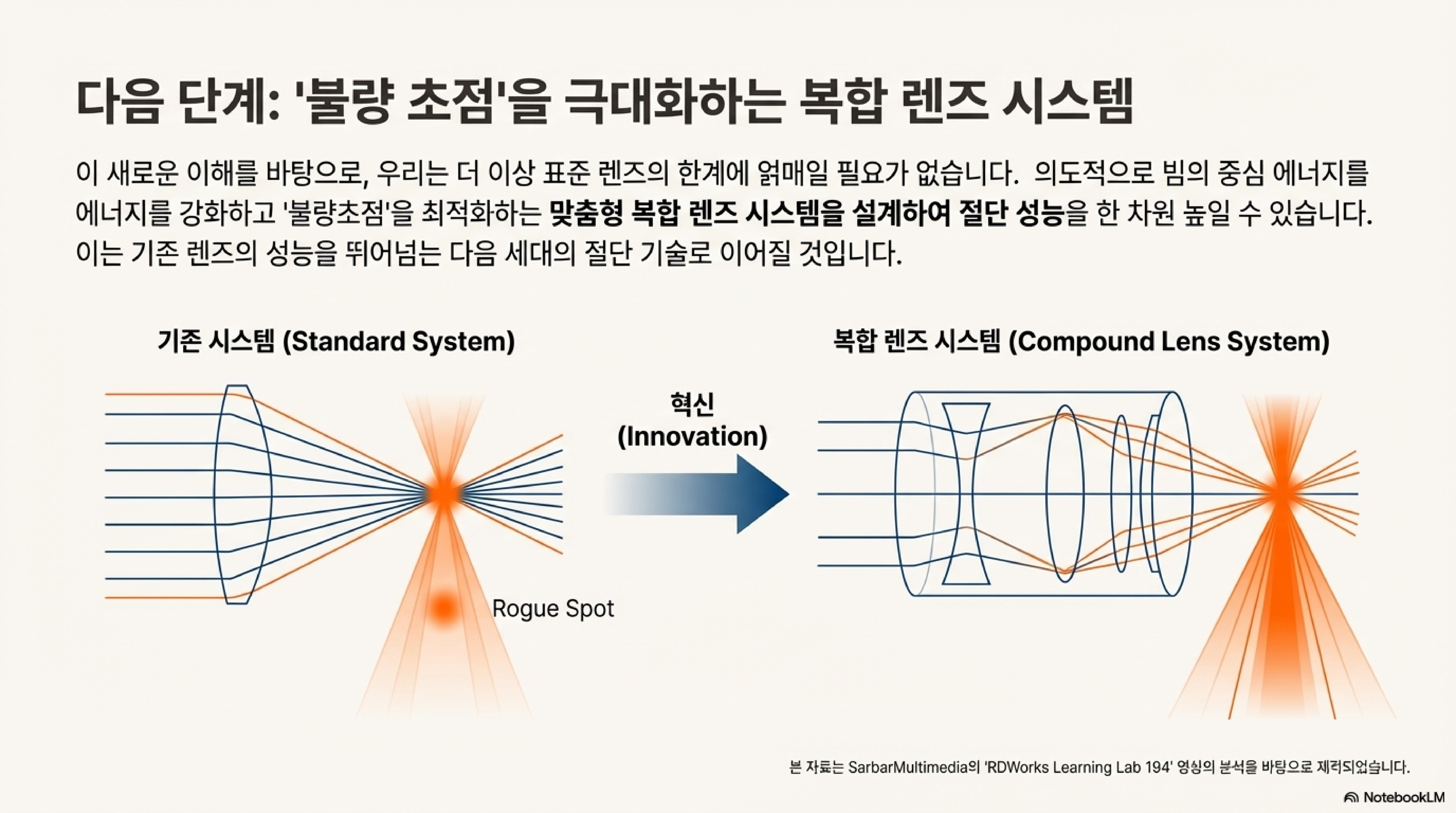 이러한 결과는 커팅 효율을 높이기 위해 에너지를 넓고 균일하게 퍼뜨리는 것이 아니라, 오히려 빔 중앙의 강력한 에너지 집중점, 즉 발표자가 '로그 스팟(Rogue Spot, 제멋대로인 지점)'이라 부르는 지점에 최대한 집중시키는 것이 더 유리하다는 사실을 보여줍니다. 이는 커팅과 인그레이빙이 완전히 다른 조건을 요구한다는 강력한 증거이기도 합니다.