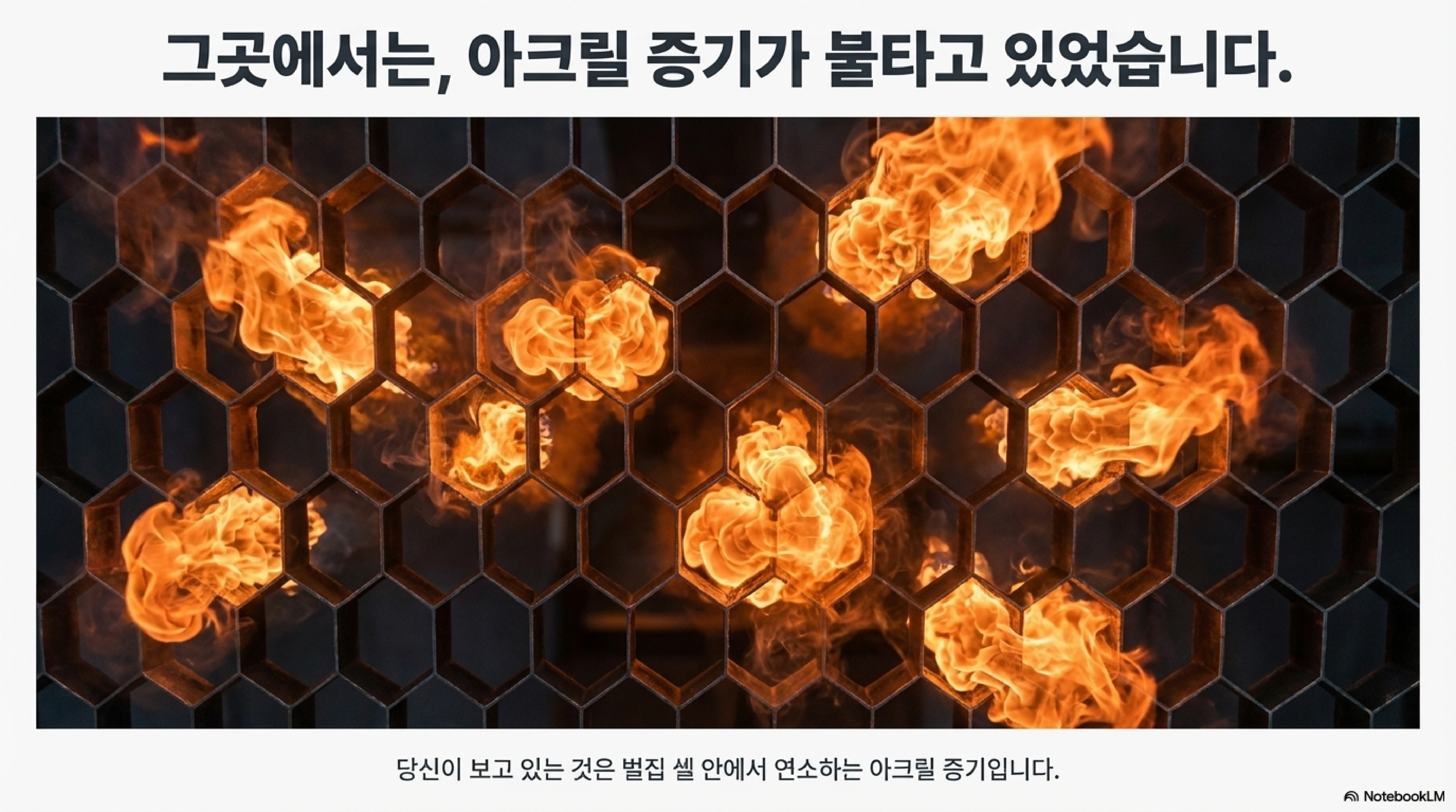 위험이 발생하는 과정은 간단하지만 치명적입니다. 아크릴과 같은 재료를 레이저로 절단하면 다량의 증기가 발생합니다. 이 증기는 작업 공간 아래에 위치한 허니콤 베드의 벌집 모양 셀 안으로 들어가 갇히게 됩니다. 문제는 그 다음입니다. 절단 과정에서 발생한 레이저의 잔여 에너지가, 차가운 허니콤 셀 내벽에 다시 달라붙어 재응축된 가연성 증기를 점화시키는 것입니다.