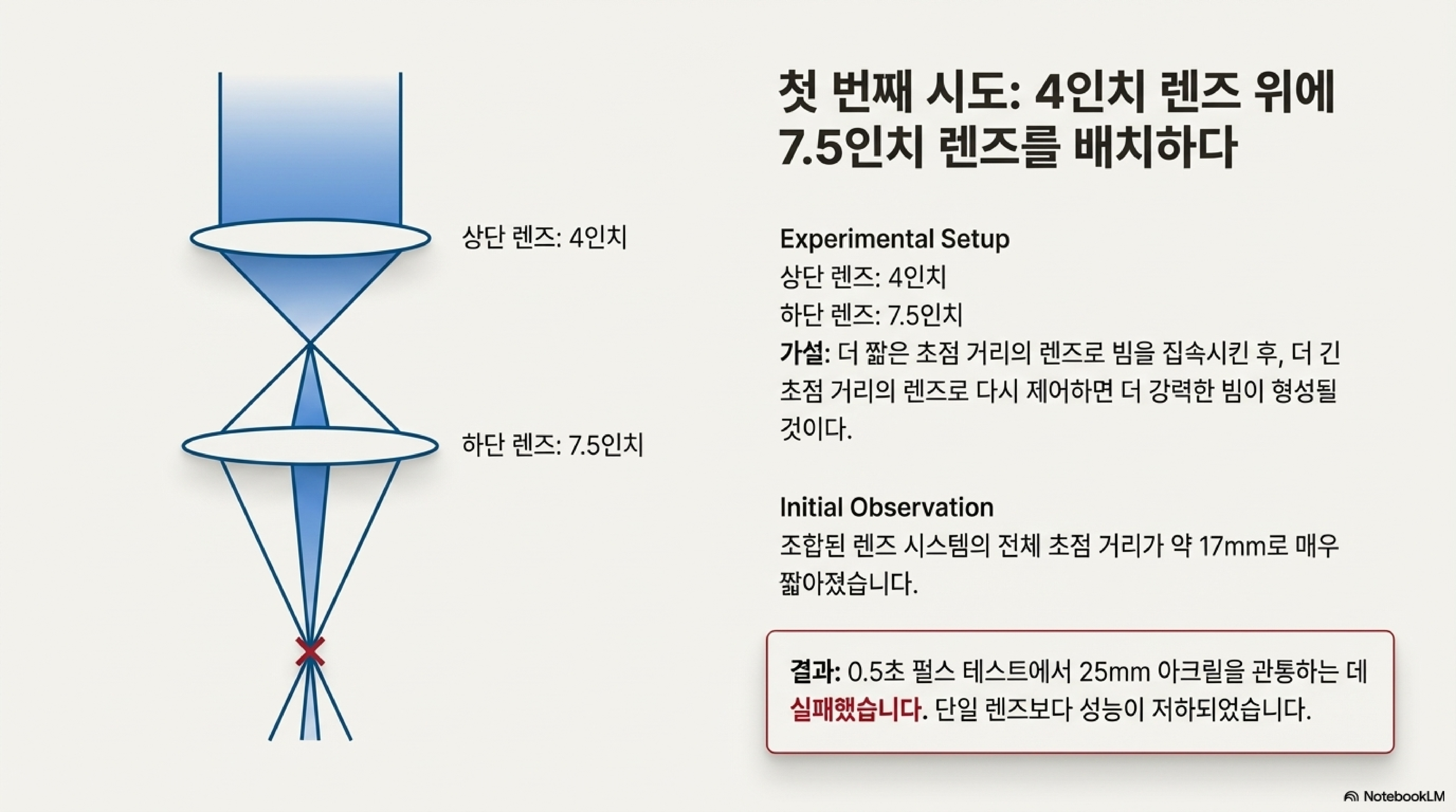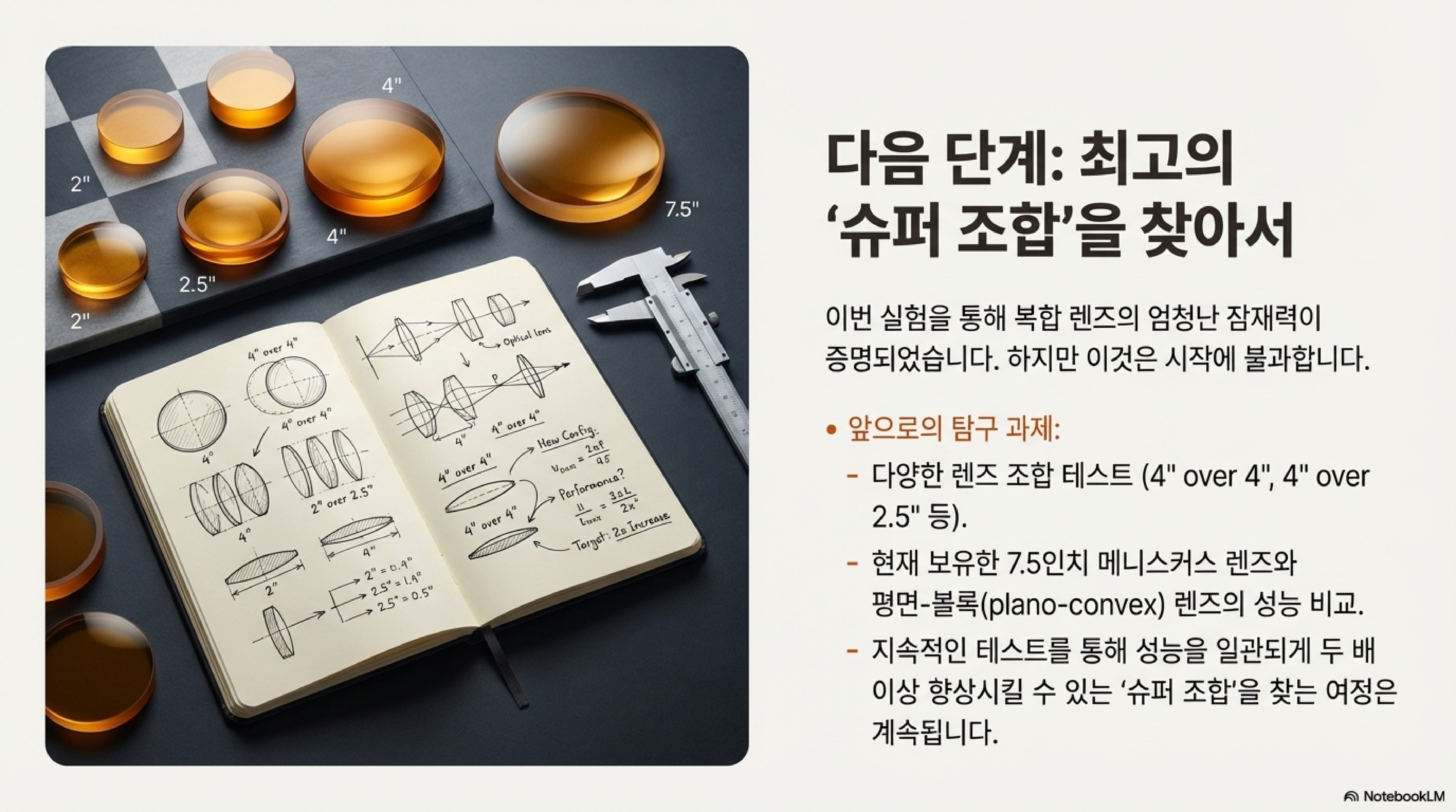 - 실패한 조합: 4인치 렌즈 + 7.5인치 렌즈 (짧은 초점 렌즈가 위) 조합은 성능을 저하시켰습니다.