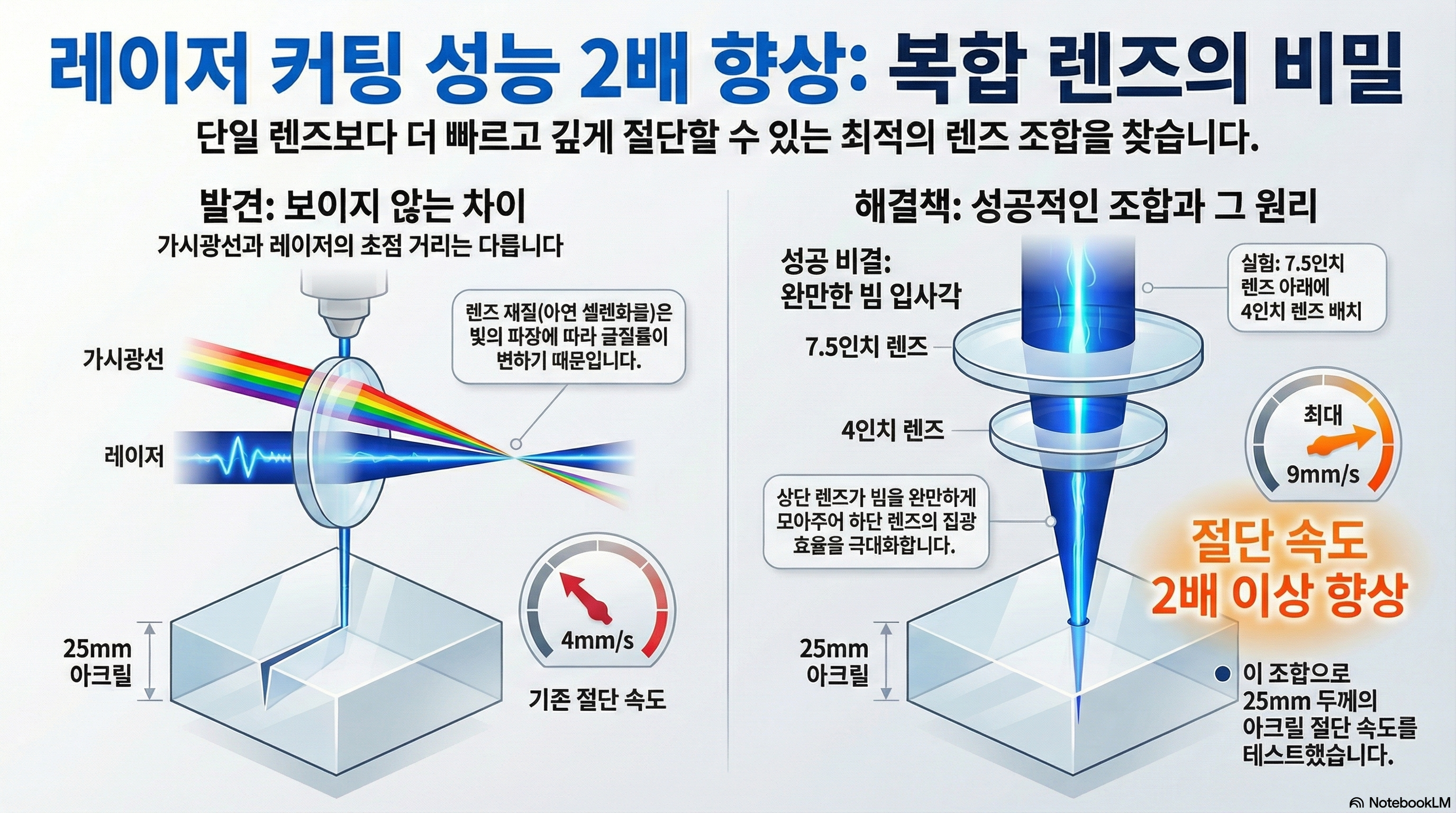 하지만 렌즈의 순서를 바꾸자 마법 같은 일이 일어났습니다. 반대로 긴 초점 렌즈(7.5인치)를 짧은 초점 렌즈(4인치) 위에 배치했을 때, 절단 속도가 비약적으로 향상되었습니다. 단일 렌즈로는 평균 6~8mm/s에 불과했던 절단 속도가 이 조합을 통해 14mm/s까지 치솟으며 거의 두 배 가까이 빨라진 것입니다.