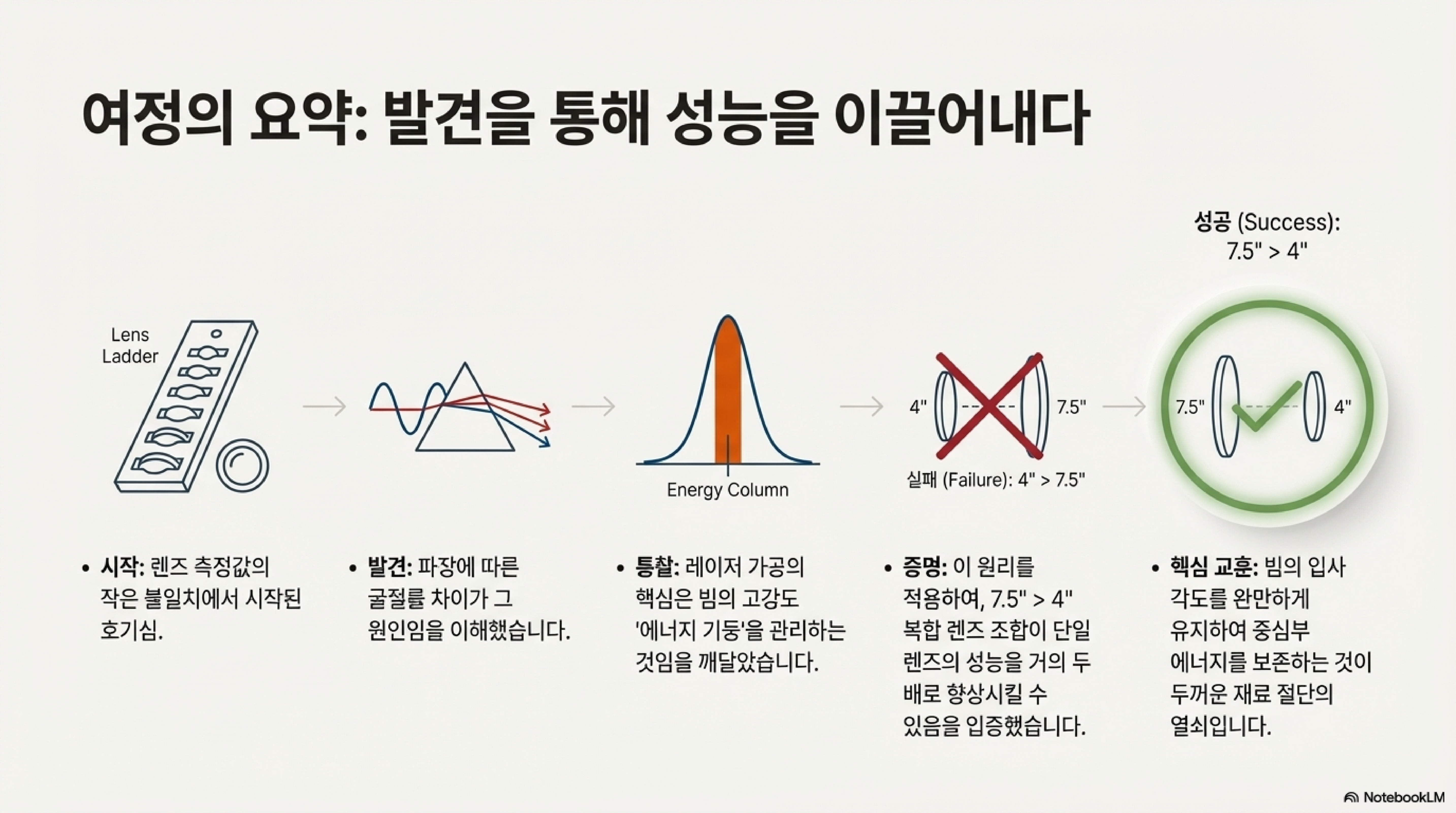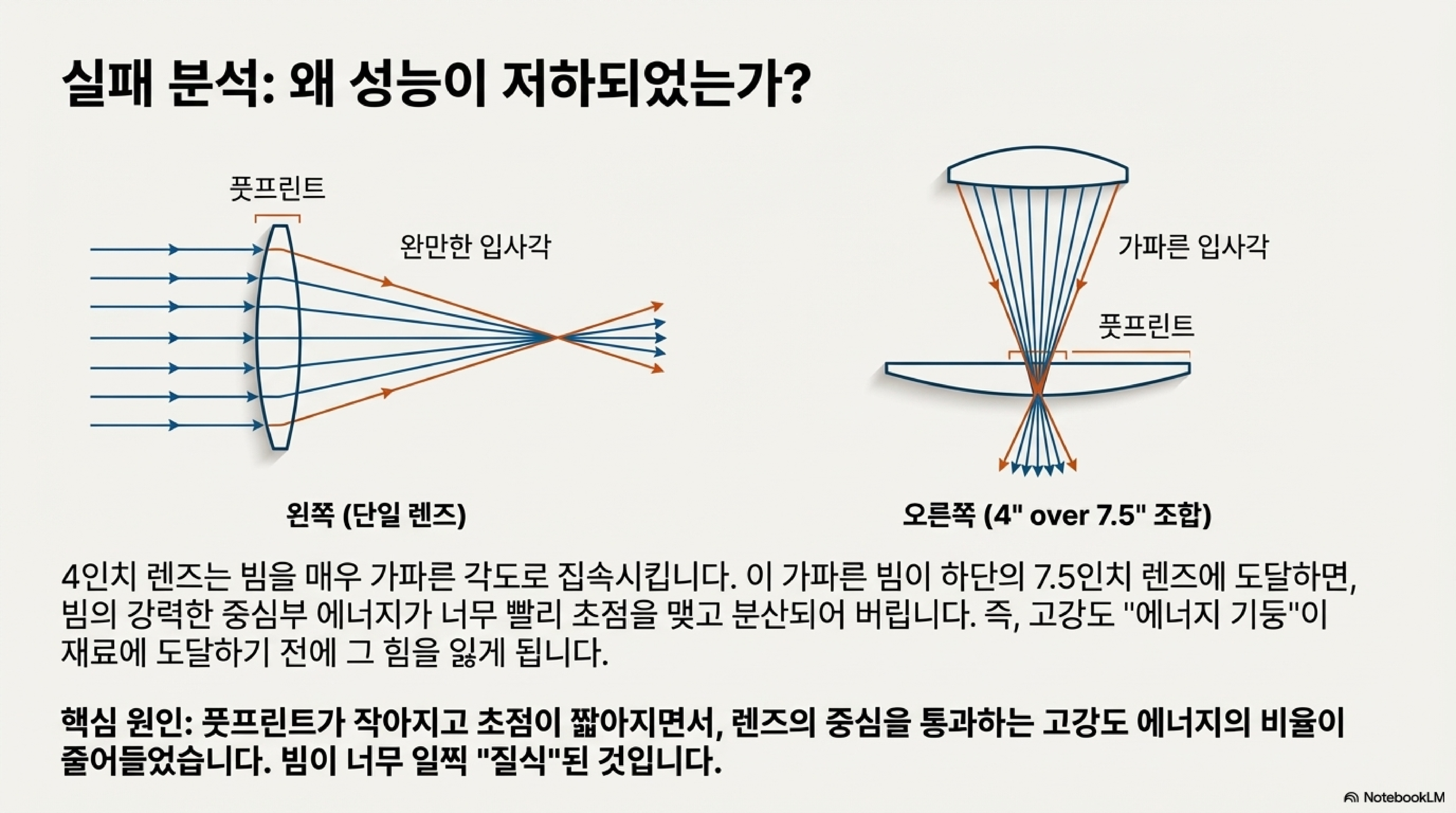 이것이 가능한 이유는 앞서 설명한 '렌즈 중심부의 힘'과 깊은 관련이 있습니다. 첫 번째 7.5인치 렌즈는 레이저 빔을 공격적으로 꺾지 않고 완만하게 모아주는 '컨디셔닝' 역할을 합니다. 그 결과, 두 번째 4인치 렌즈에 도달하는 빔의 중심부 광선들은 거의 평행에 가까운 상태를 유지하게 됩니다. 이 '준비된' 광선들은 두 번째 렌즈의 중심부를 통과하며 과도하게 굴절되지 않고, 그 강력한 '힘의 스파이크'를 온전히 보존한 채 더 멀리까지 전달될 수 있게 됩니다. 이것이 절단 성능을 폭발적으로 증가시킨 핵심 원리입니다.