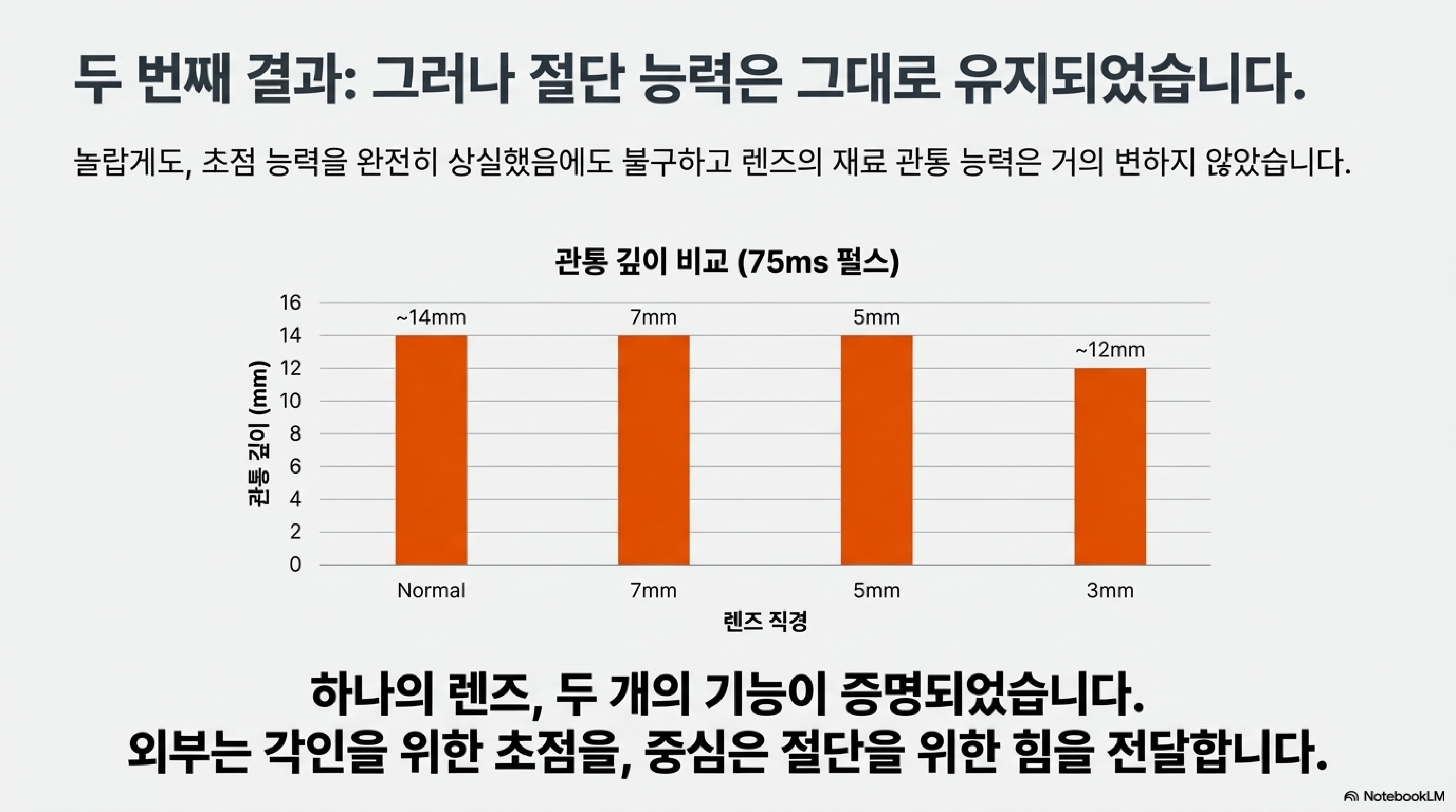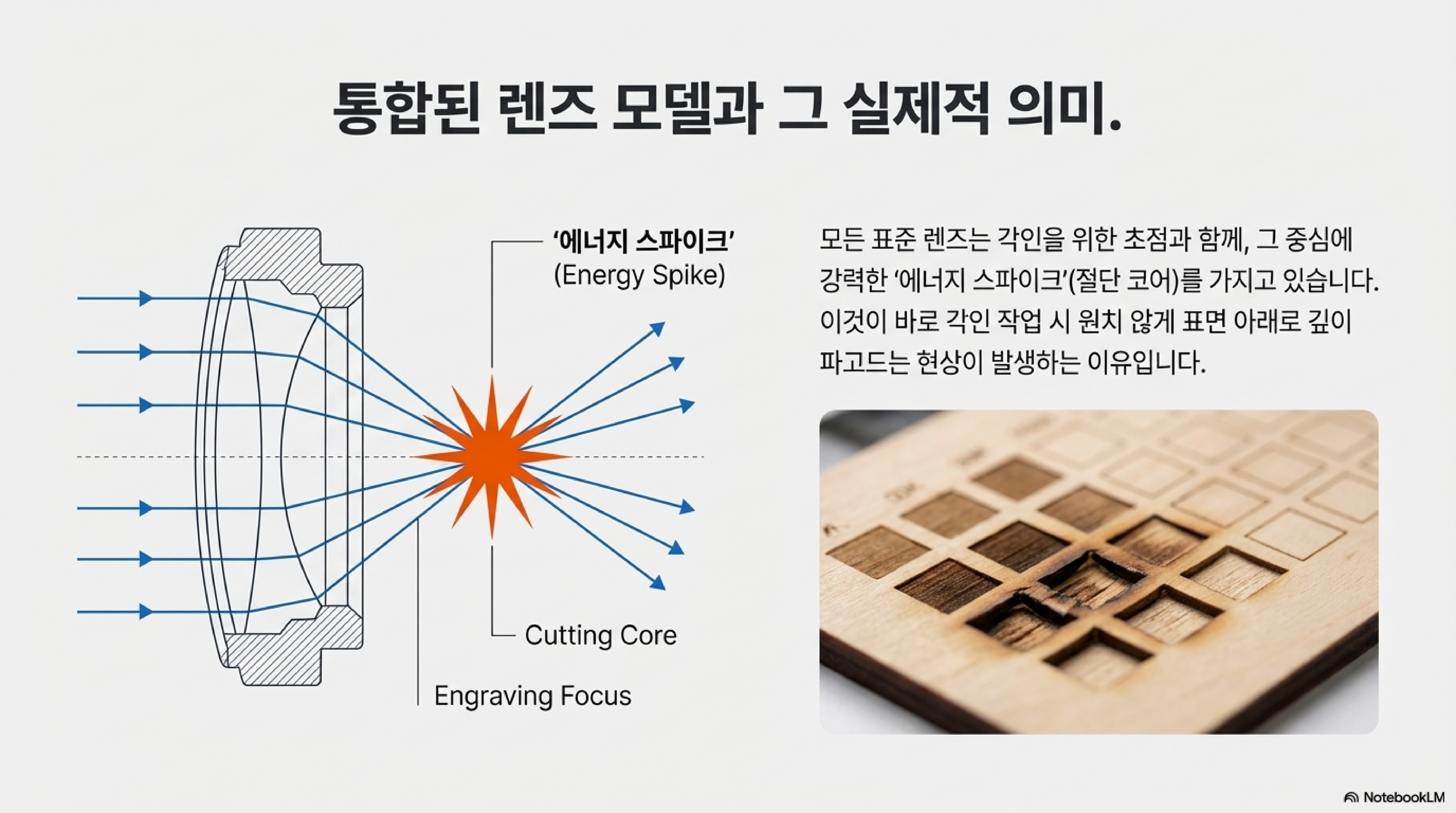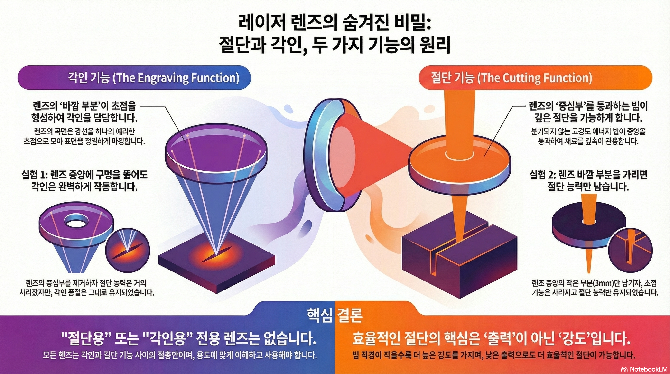 이 두 실험은 렌즈의 '커팅 기능'과 '인그레이빙(초점) 기능'이 물리적으로 분리될 수 있음을 보여줍니다.