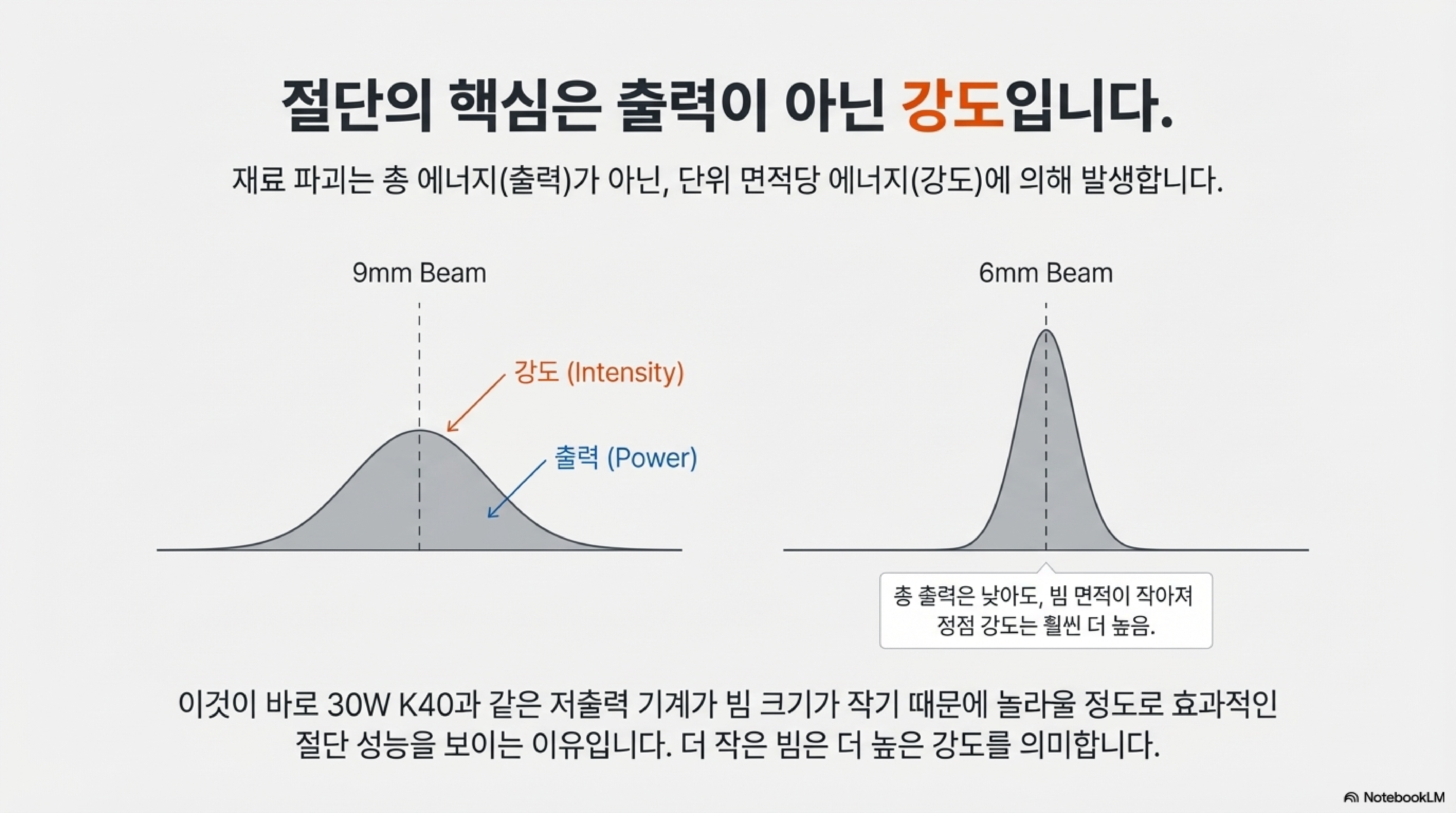 많은 사용자들이 더 나은 커팅을 위해 무조건 레이저의 출력(와트)을 높여야 한다고 생각합니다. 하지만 실제 커팅 효율을 결정하는 것은 총 출력이 아니라 단위 면적당 힘, 즉 **광도(Intensity)**입니다.