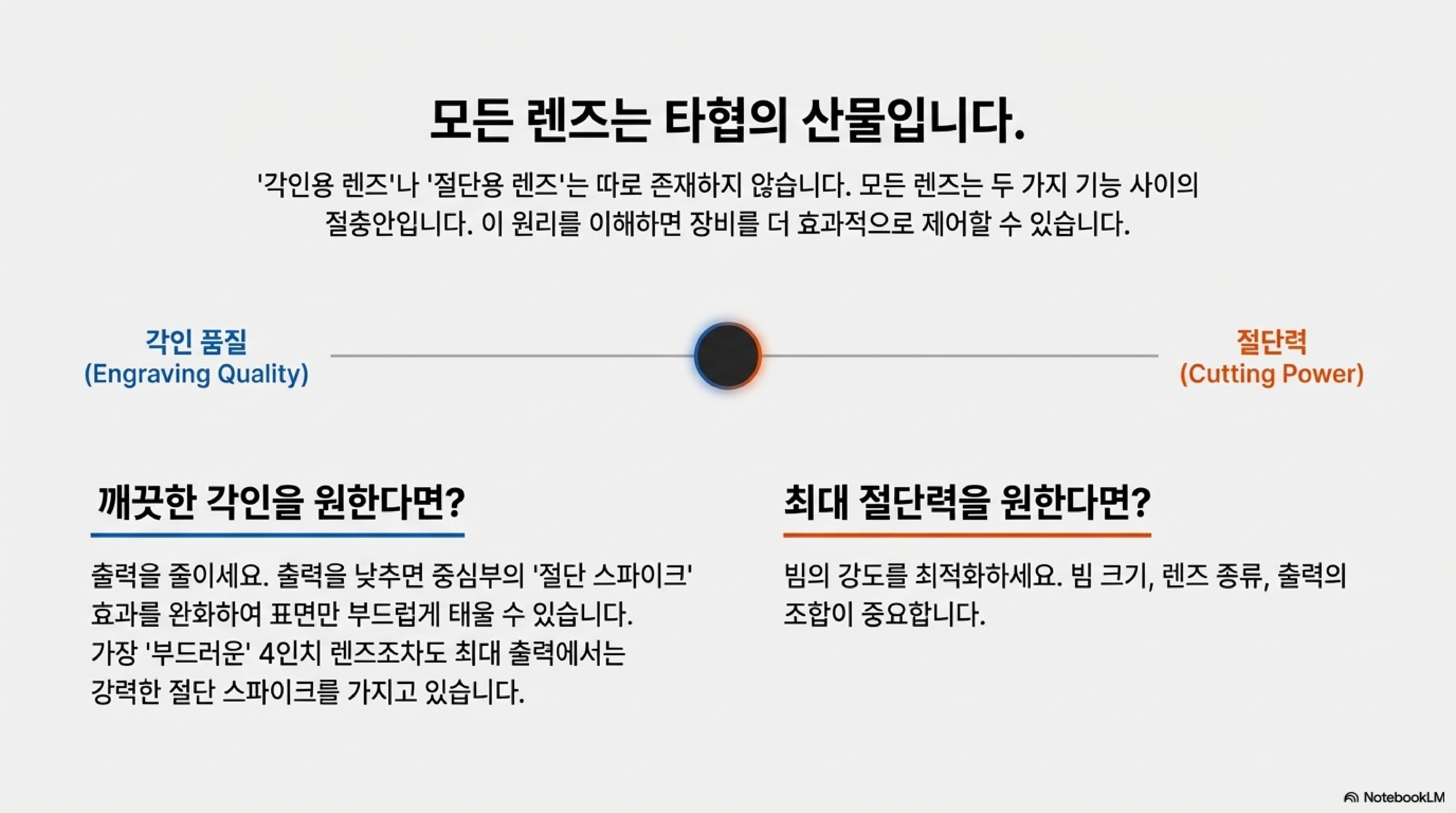 중요한 것은 얼마나 많은 에너지를 보내느냐가 아니라, 얼마나 작은 지점에 에너지를 집중시키느냐입니다. 이 원리가 바로 단순히 파워를 높이는 것이 항상 더 나은 커팅으로 이어지지 않는 핵심적인 이유입니다.