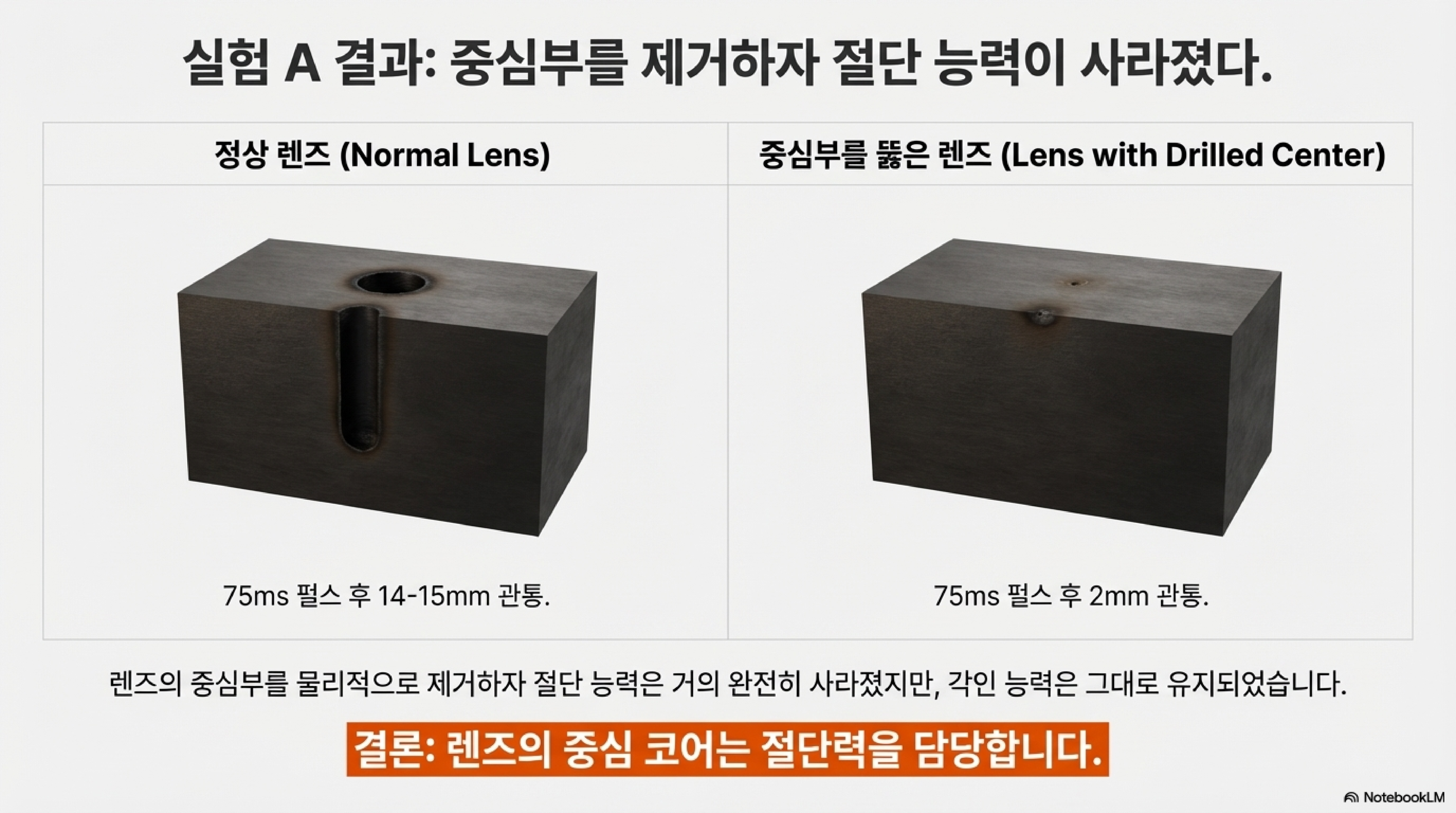 - 실험 1: 렌즈 중앙에 구멍을 뚫다 (The Hole) 렌즈의 정중앙에 구멍을 뚫어 중심축을 제거했습니다. 그 결과는 놀라웠습니다. 렌즈의 깊은 절단 능력이 거의 완전히 파괴되었습니다. 원래 렌즈가 시간차 펄스 테스트에서 재료를 14~15mm 깊이까지 뚫을 수 있었던 반면, 구멍 뚫린 렌즈는 고작 2mm밖에 뚫지 못했습니다. 하지만 표면에 인그레이빙하는 능력은 완벽하게 유지되었습니다. 이는 렌즈의 중심축이 커팅 파워를 전달하는 핵심 통로임을 명백히 증명합니다.