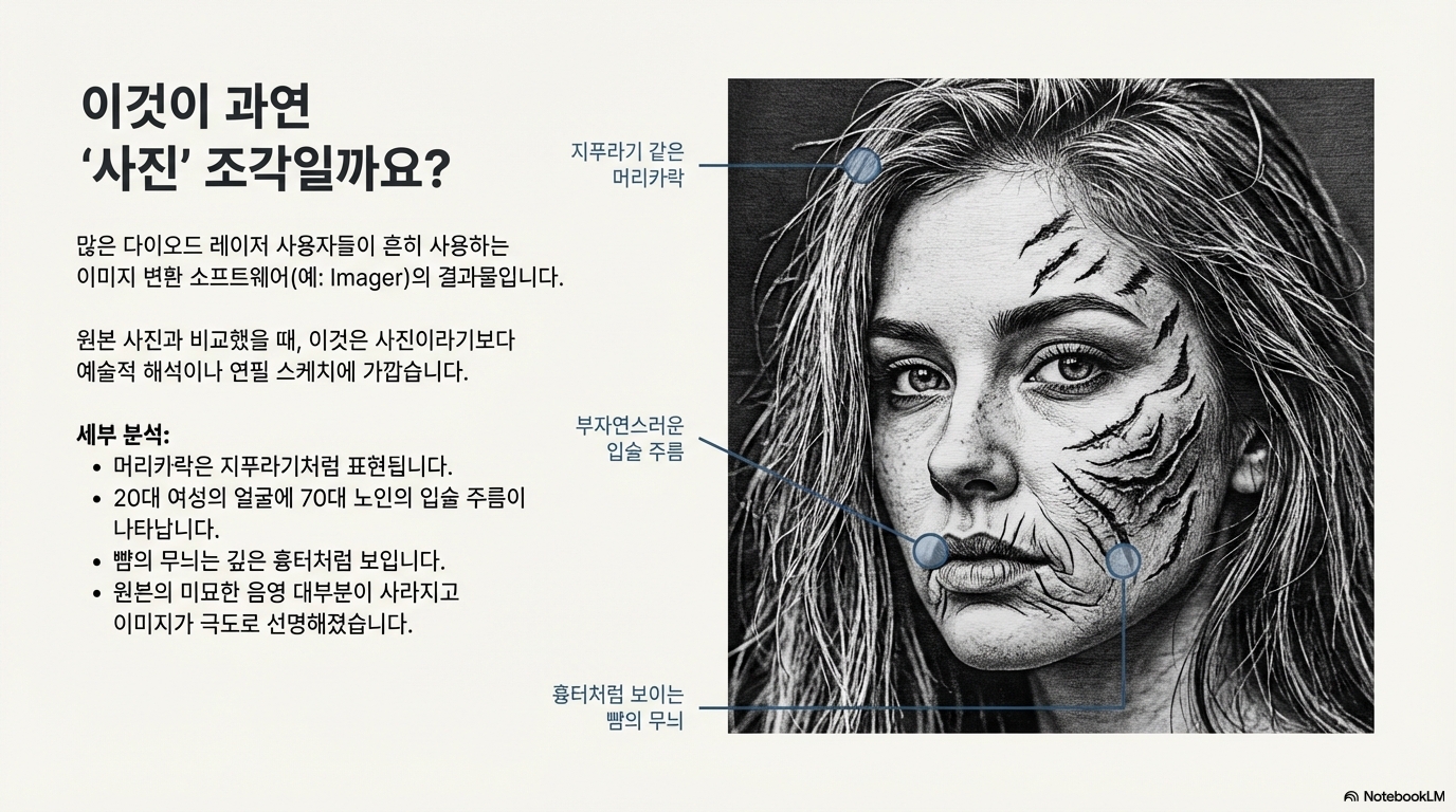 이 소프트웨어들은 원본 사진을 극도로 선명하게 만들고 대비를 높여, 마치 "만화 연필 스케치"처럼 '왜곡'된 결과물을 만들어냅니다. 왜 이런 일을 할까요? 바로 점 오버랩 문제를 가장 심하게 일으키는 '단일 픽셀'들을 이미지에서 인위적으로 제거하기 위해서입니다. 미세한 회색 음영을 표현하던 섬세한 픽셀들을 뭉개버림으로써, 하드웨어의 단점을 보완하려는 것입니다.