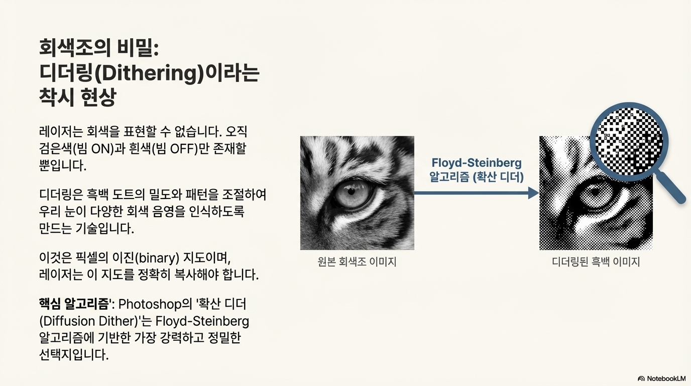 레이저 기계는 실제로 회색 음영을 각인할 수 없습니다. 우리가 보는 최종 결과물은 흰색 배경 위에 오직 검은 점들로만 구성된 '이진(binary)' 이미지일 뿐입니다.