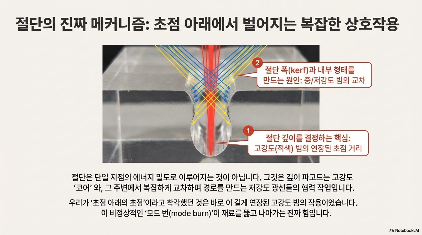 새로운 모델에 따르면, 깊은 절단 능력은 "초점 아래에서 발생하는 기이한 비-가우시안 모드 번(strange non-gaussian mode burn)" 현상에서 비롯됩니다. 이를 쉽게 설명하면 이렇습니다. 재료 표면을 뚫고 들어간 고강도 중심 광선이 길을 만드는 동안, 그 뒤를 따르던 주변 광선들이 계속해서 안쪽으로 수렴하며 바로 그 지점에 에너지를 더합니다. 이는 마치 선두 드릴 비트에 여러 개의 보조 드릴이 힘을 보태는 것과 같은, 강력하고 지속적인 침식 과정입니다. 커팅은 정적인 한 지점의 에너지가 아니라, 여러 광선이 복합적으로 작용하며 재료를 깎아내는 역동적인 과정인 것입니다.