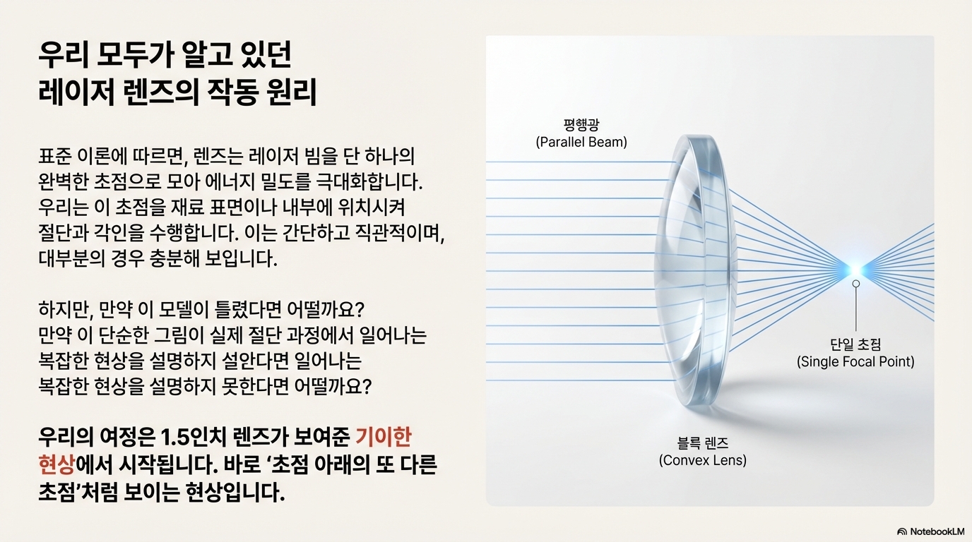 광학에서 '구면 수차(spherical aberration)'는 일반적으로 렌즈의 결함으로 간주됩니다. 렌즈의 구면 형태 때문에 빛이 완벽하게 한 점에 모이지 못하고 흩어지는 현상을 말하죠. 하지만 놀랍게도, 이 '약점'이야말로 렌즈가 효과적으로 재료를 절단할 수 있게 만드는 핵심적인 속성입니다.