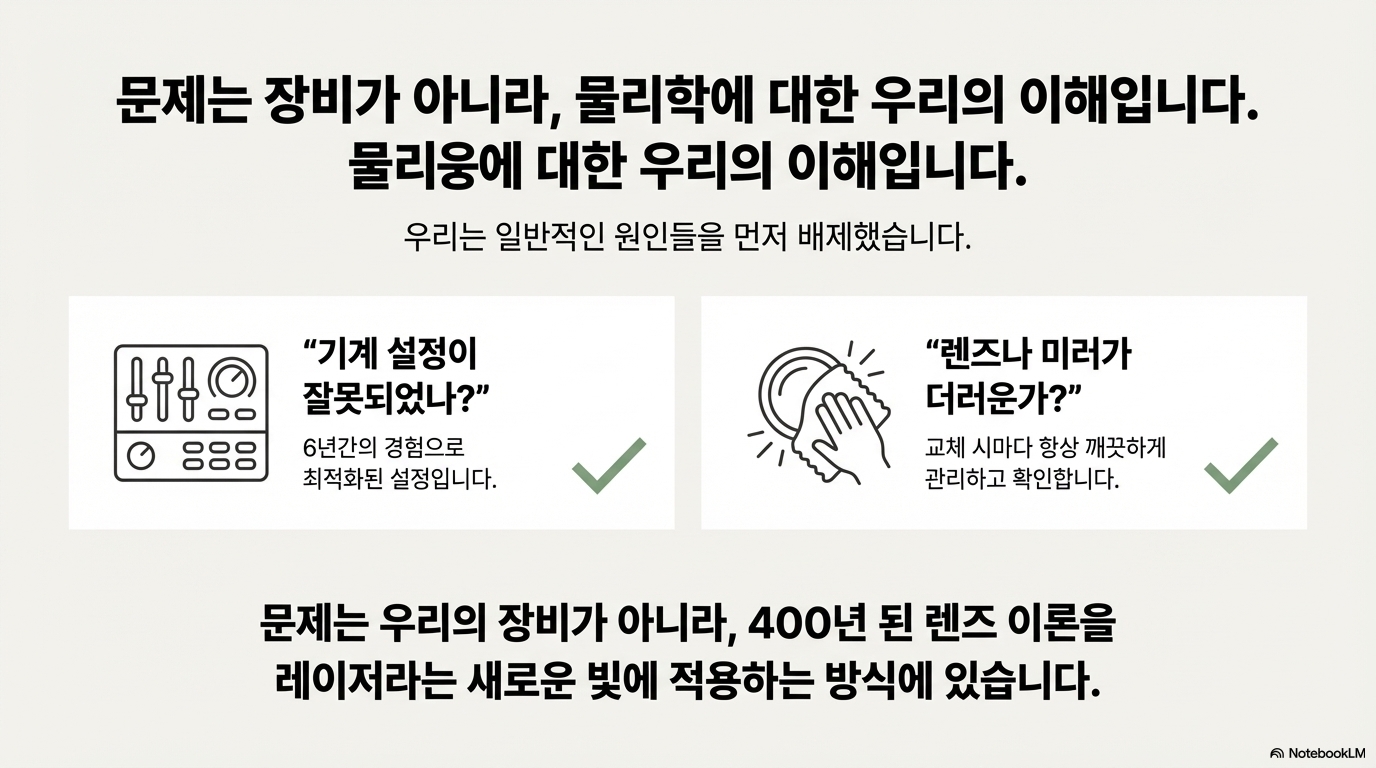 만약 문제가 당신의 기계나 설정, 혹은 렌즈 자체가 아니라, 우리가 지금까지 따라왔던 근본적인 이론에 있다면 어떨까요? 이 질문은 저를 깊은 탐구의 길로 이끌었고, 그 과정에서 400년 동안 이어진 기존 렌즈 이론을 현대 레이저 기술에 적용할 때 발생하는 문제점과 놀라운 사실들을 발견하게 되었습니다.