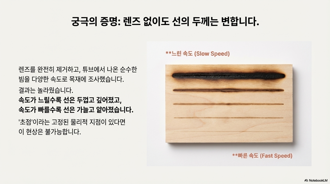 가장 직관에 반하는 강력한 증거는 렌즈 어셈블리를 완전히 제거하고 가공되지 않은 레이저 빔을 재료에 직접 쏘는 실험에서 나왔습니다.