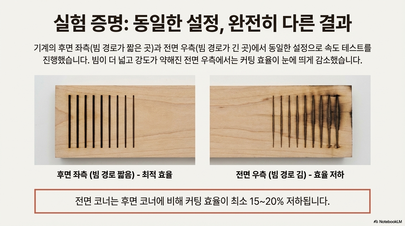 실험 결과는 이 사실을 명확히 보여줍니다. 기계의 좌측 후면과 우측 전면에서 절단 효율을 비교했을 때, 빔이 더 작고 강도가 높았던 뒤쪽 구석에서의 절단 효율이 "최소 15~20% 더 높았습니다." 솔직히 말해, 이 테스트를 직접 해보기 전까지는 저도 이 정도의 차이가 있을 것이라고 예상하지 못해 매우 놀랐습니다. 이처럼 흔히 무시되는 단 하나의 요인이 실제 절단 결과에 엄청난 영향을 미칩니다. 이 절단력의 저하는 단순한 기하학적 '스팟 사이즈'가 레이저 성능을 생각하는 잘못된 방식이라는 첫 번째 중요한 단서이며, 진짜 핵심 요소는 바로 *강도(intensity)*라는 것을 암시합니다.