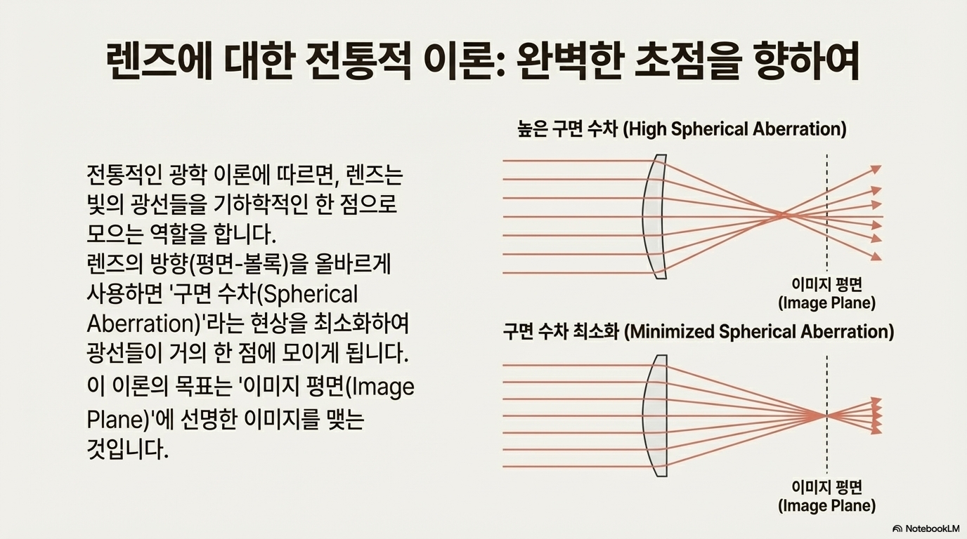 기존의 렌즈 사양은 카메라, 프로젝터, 현미경과 같은 분야를 위해 설계된 고전 광학 이론에 기반합니다. 이 이론의 목표는 광선을 한 점으로 모아 완벽한 "이미지 평면(image plane)"을 만드는 것입니다.
