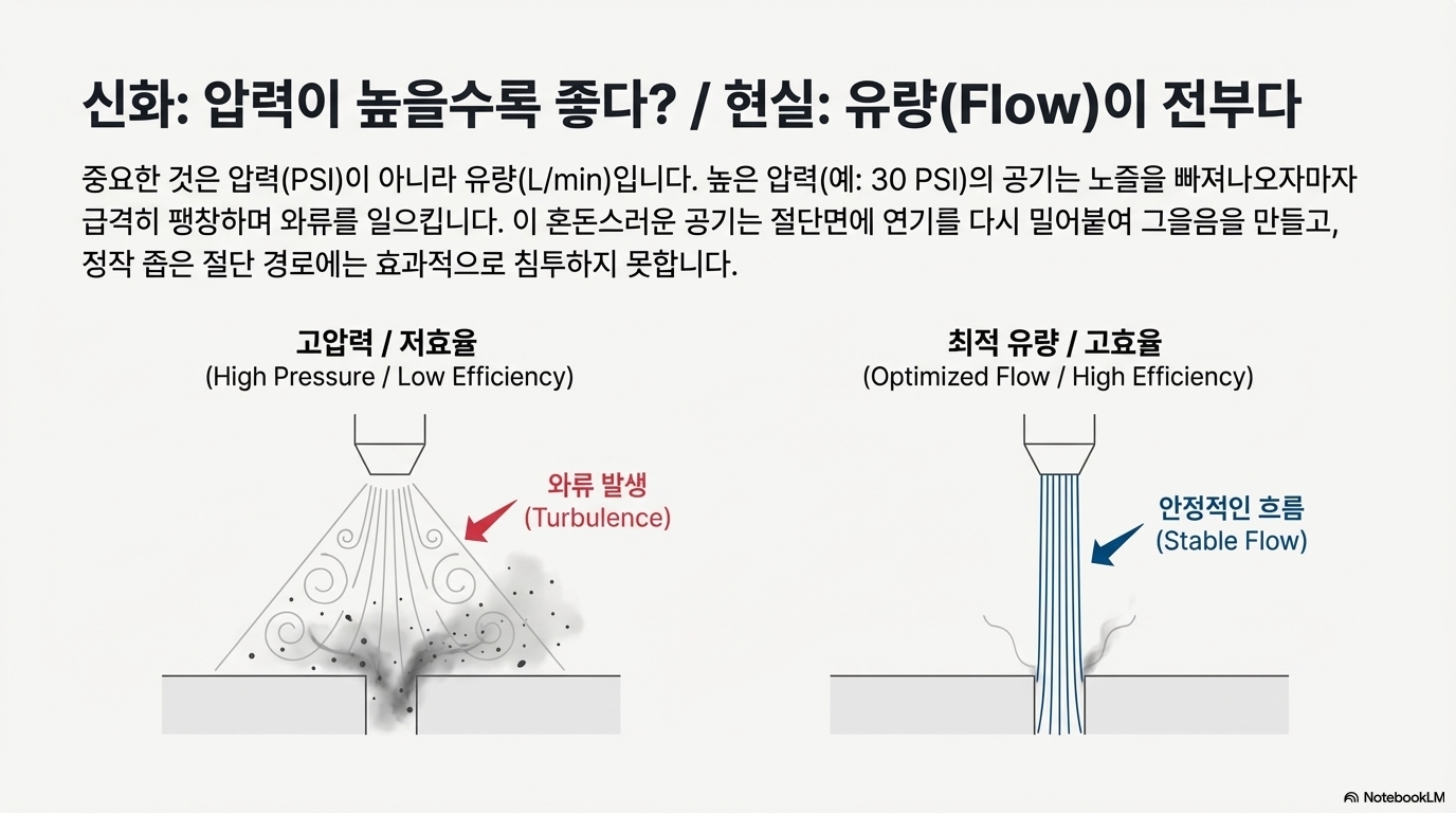 에어 어시스트의 진정한 목표는 분해된 고체 입자(연기)를 레이저 빔의 경로에서 신속하게 제거하는 것입니다. 이를 위해 필요한 것은 무작정 높은 압력이 아니라, 커팅 지점에 정확하게 전달되는 **'안정적인 공기 흐름(유량, Liters/Minute)'**입니다.